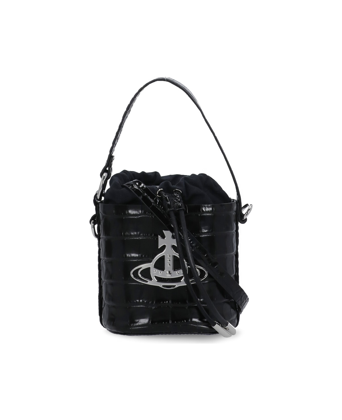 - Black Vivienne Westwood bucket bag for woman - Drawstrings fastening - One handle - Embossed Croc pattern all-over - Removable and adjustable shoulder strap - Front metal Orb logo Composition: 65% Polyurethane, 20% Polyester, 15% Cotton