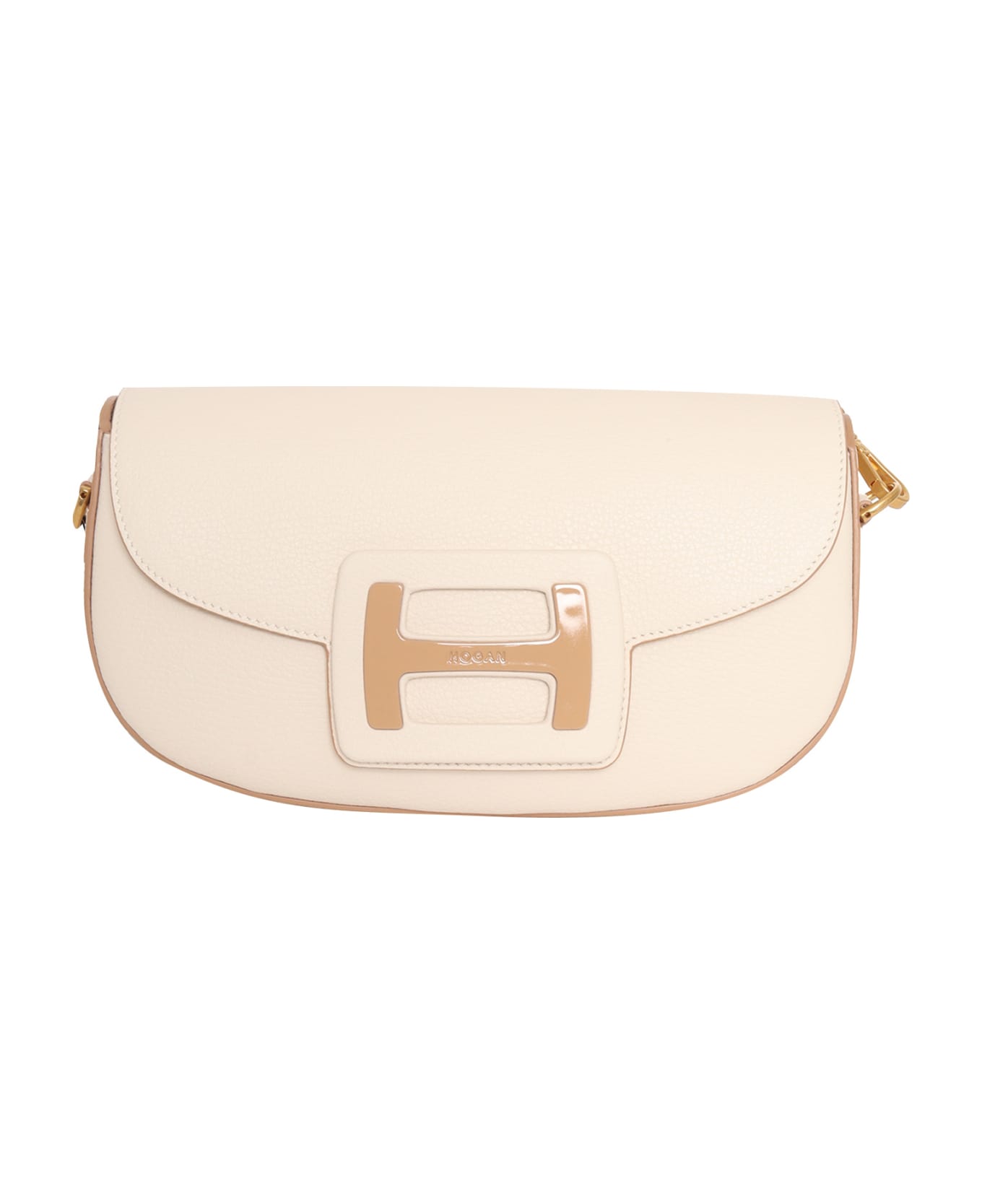 Leather bag, H buckle with logo, flap and magnetic button fastening, inside pocket, removable shoulder strap in leather and metal
