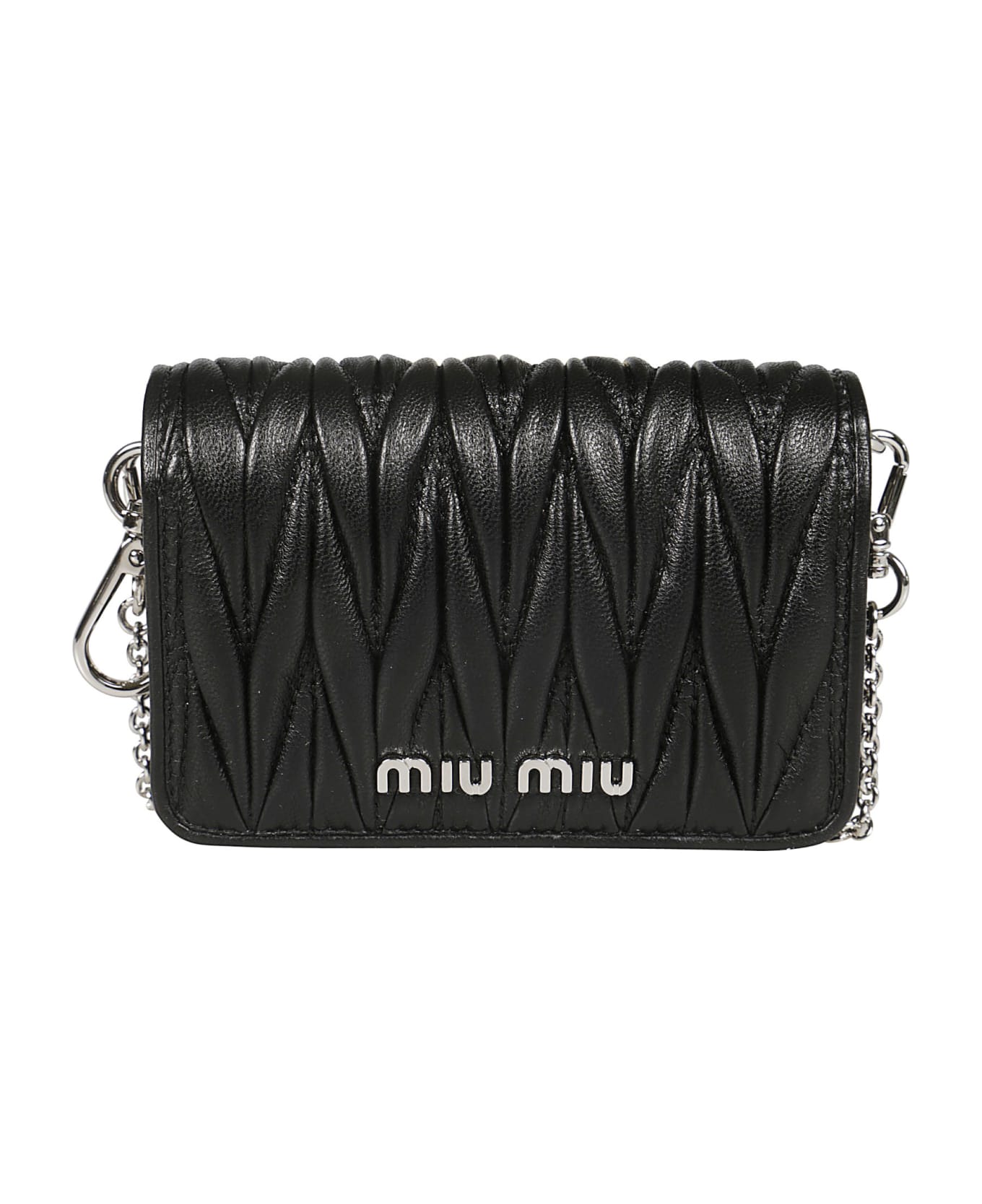 Matelassé Mini Shoulder Bag from Miu Miu: Black Matelassé Mini Shoulder Bag with fold over top, magnetic closure, main internal compartment, lobster clasp closure and silver tone chain shoulder strap. Composition: 100% Metal (Other)
