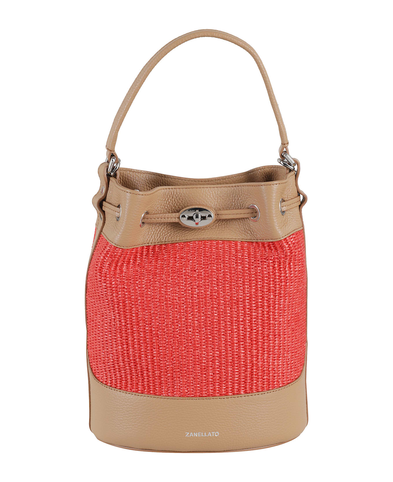 Mondà Wicker Bag - Zanellato - Red color - Made of wicker - Bucket design - Hammered leather inserts - Top handle - Adjustable and removable shoulder strap - Interior magnetic closure - Dimensions: 28 x 29 x 14 cm.