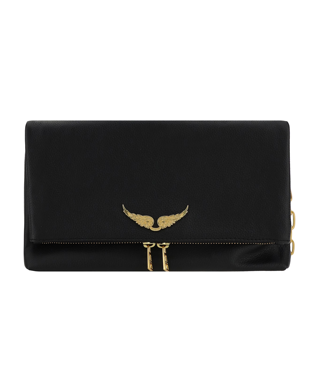 Leather rocky shoulder bag by zadig&voltaire, grained leather design, removable chain handle, removable and adjustable leather shoulder strap, rear zippered slit pocket, can be carried on the shoulder or cross-body, double-slider zipper closure on front flap, iconic contrasting brand logo on front.