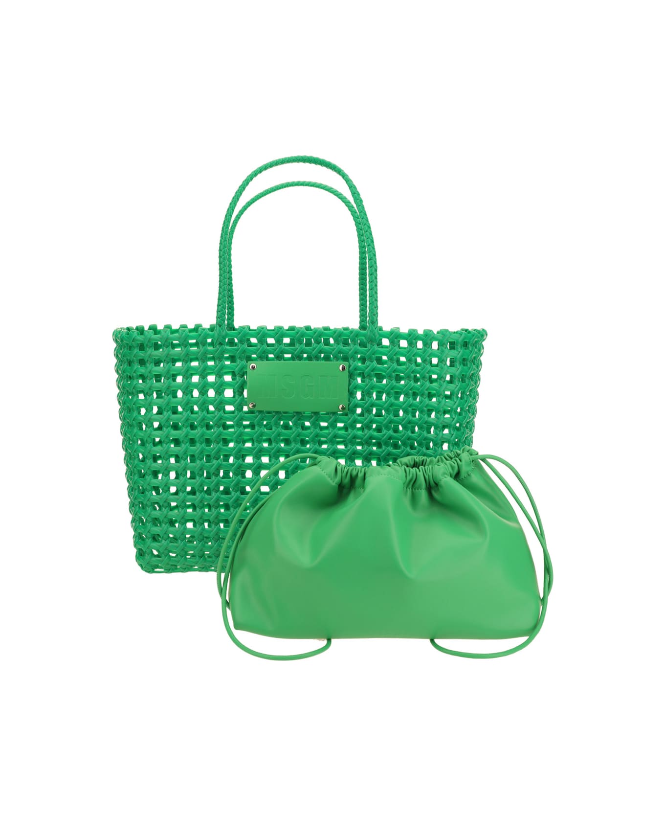 Shopping bag by msgm, double handles at top, matching iconic brand monogram plaque at front, all-over braided design, matching interior pouch with drawstring top closure.