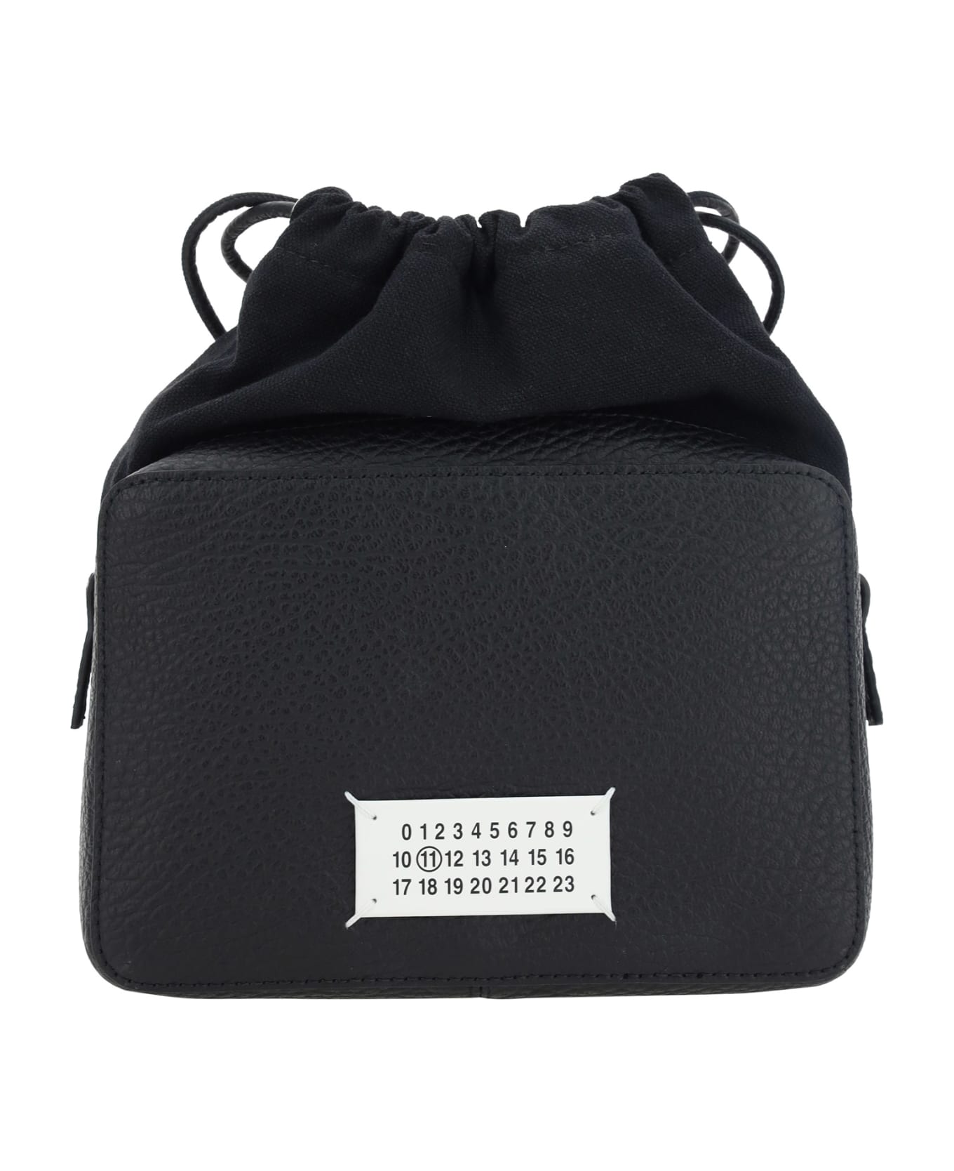 Calfskin shoulder bag by margiela, panel design in maroon leather and cotton, reversible bucket model, adjustable drawstring top closure, single internal compartment, removable leather flat shoulder strap, iconic patch and contrasting brand topstitching on the front.