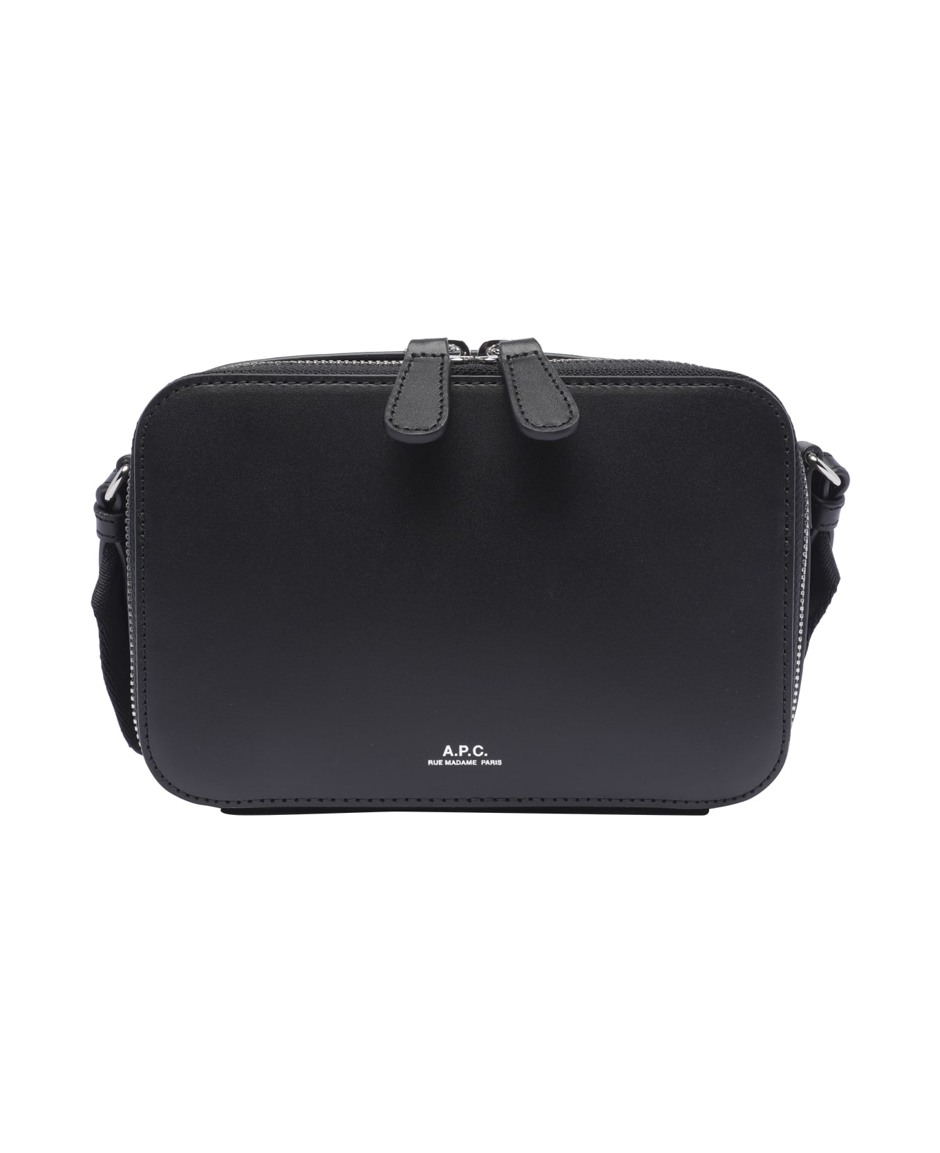 A. P. C. black Soho camera bag, zip closure, inner open pocket, adjustable shoulder strap, frontal logo