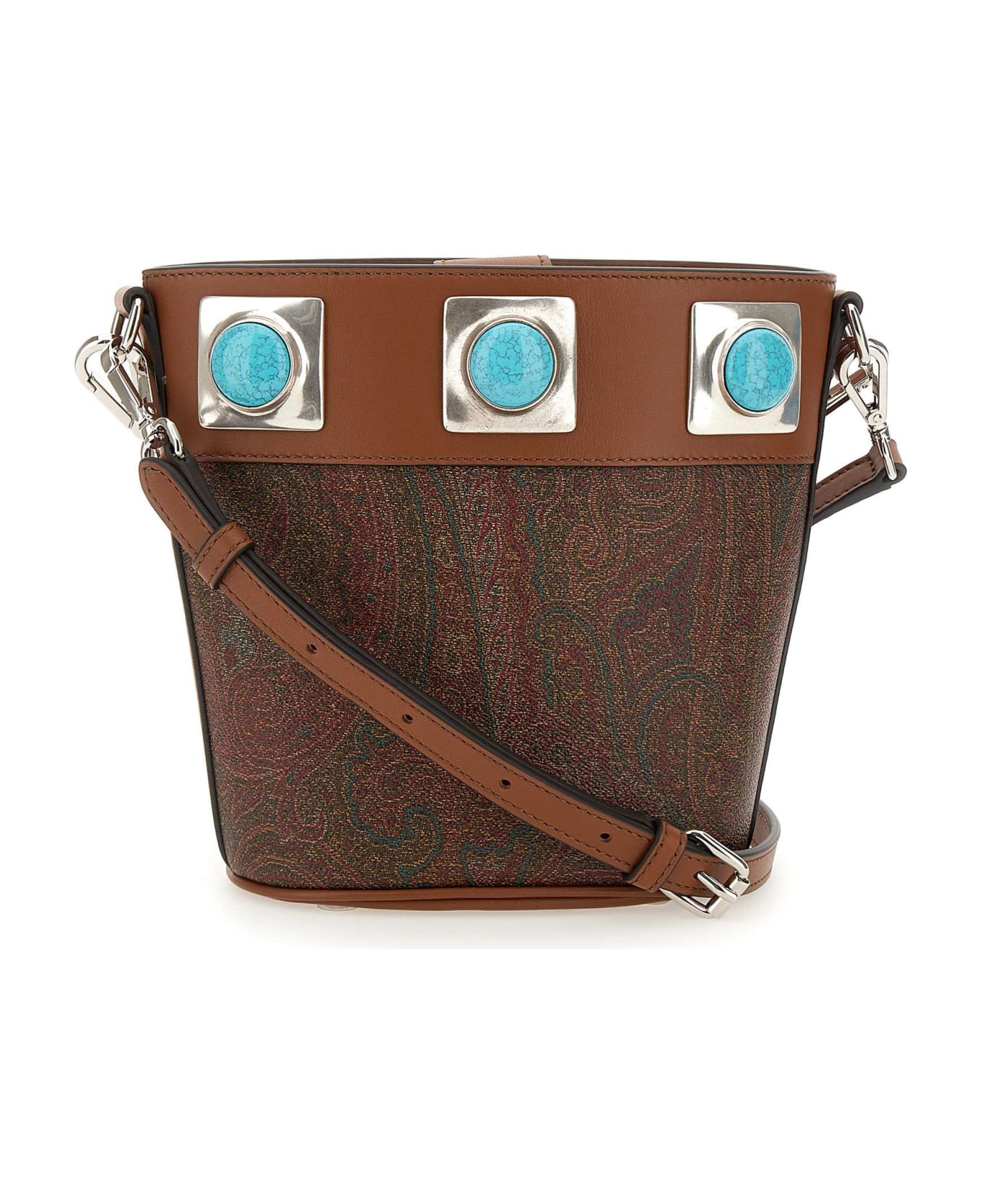 Etro handbag collection "Crown Me", multicolor pattern in cotton fabric Paisley jacquard coated with matte grain and doubled canvas, leather profiles, bucket model, decorative detail on front with square metal studs embellished with turquoise cabochon stones, inside zipper pocket, shiny silver metal trim, removable and adjustable shoulder strap, upper handle, logo embossed on back. Made in Itally. Dimensions length 19cm, height 16cm, depth 9cm. Strap length 85cm. Fabric case included.