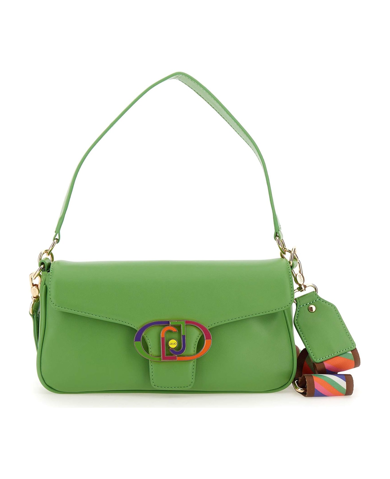 Shoulder bag Liu-Jo "Misa", apple green, baguette design, eco-sustainable in PU, multicolor enamelled metal logo, top handle, two internal pockets, one of which with zip, logoed internal lining, fastening with flap and magnetic button, removable multicolored shoulder strap. Dimensions: length 27cm, depth 6cm, height 15cm.