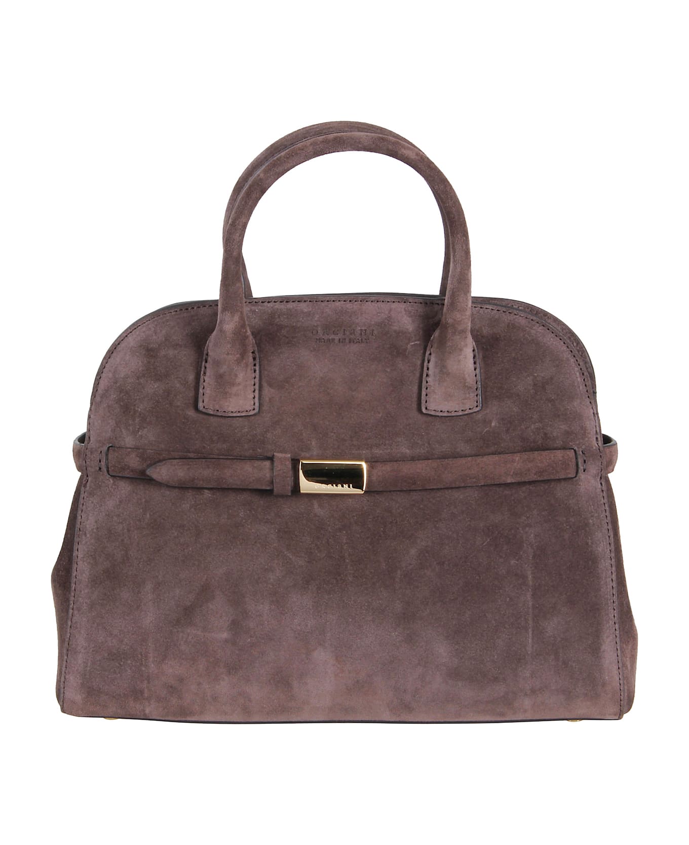 Aura Suede bag -Orciani -Dark brown color -Double handles -One internal compartment -Front logo -Buckle -Magnetic button closure -Adjustable and removable shoulder strap -Dimensions: Width 30cm x Height 24cm x Depth 11cm