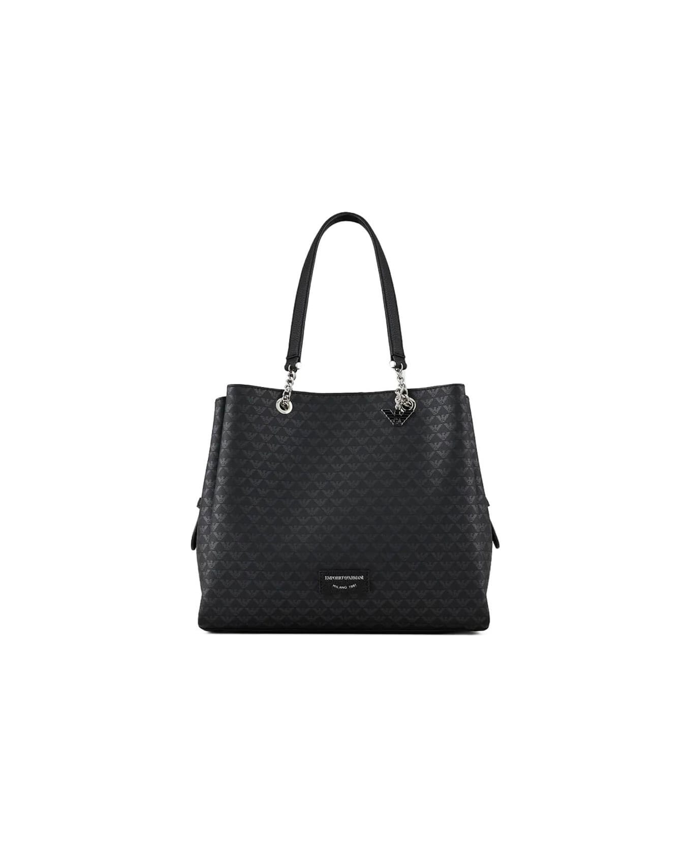 Shopping bag by Emporio Armani in black imitation leather with all-over monogram print. Front logo and charm with iconic eagle, interior divided into three compartments, including one with zip. Double handle with chain insert and removable shoulder strap. Equipped with detachable internal pouch with zip, measures 31x25x15 cm.