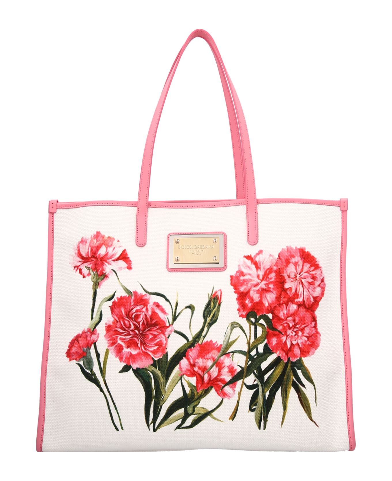 Floral print canvas shopping bag with calf leather handles, a printed fabric lining and a zip pocket.