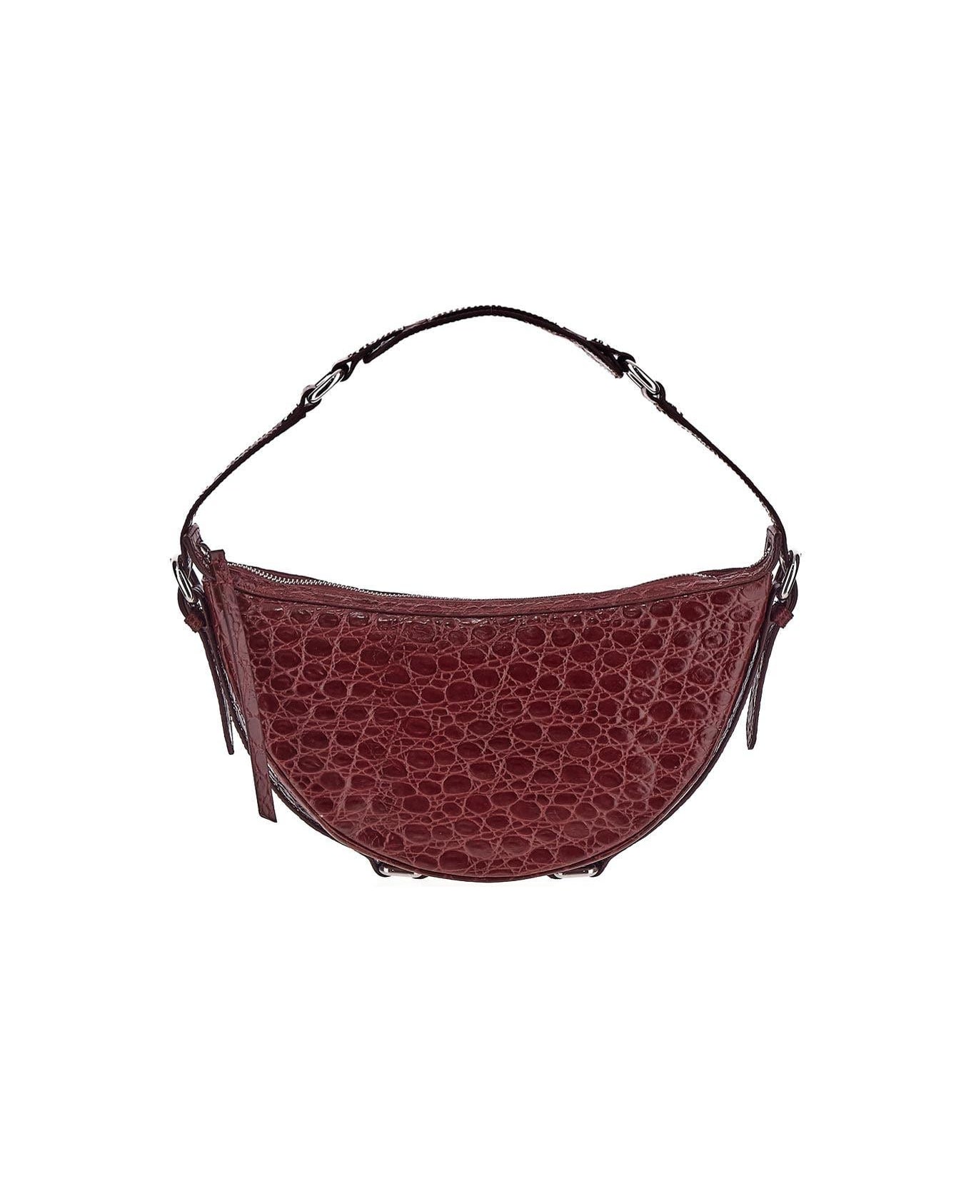 By Far bag in burgundy leather with single top handle. The item is featured by zip closure, crocodile effect, and silver-tone hardware.