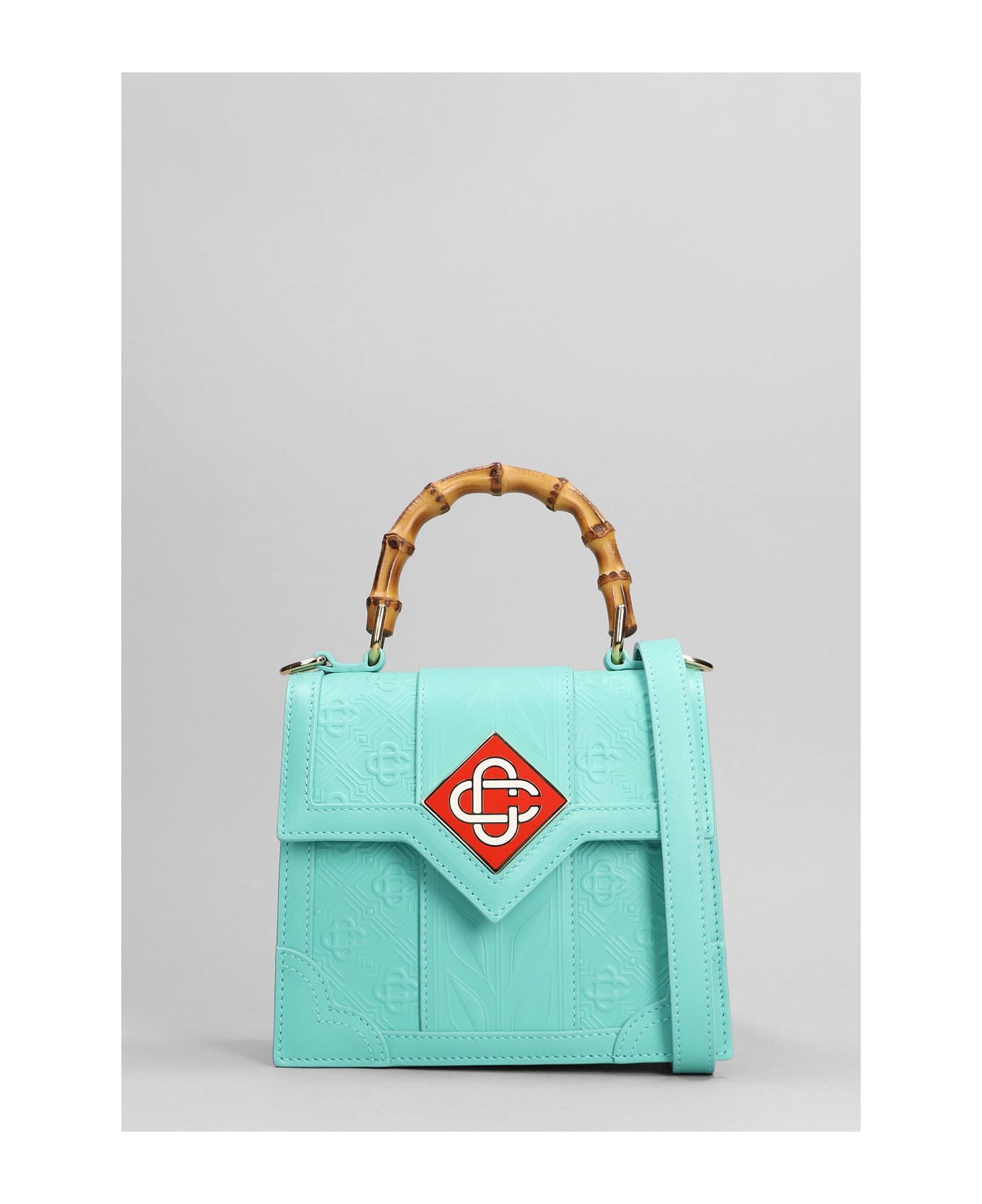 Jeanne Hand bag in cyan leather, hard top handle, detachable shoulder strap, magnetic closure, textured finish, bamboo detail, 100% leather, Made in Italy, Height 155 mm, Width 165 mm