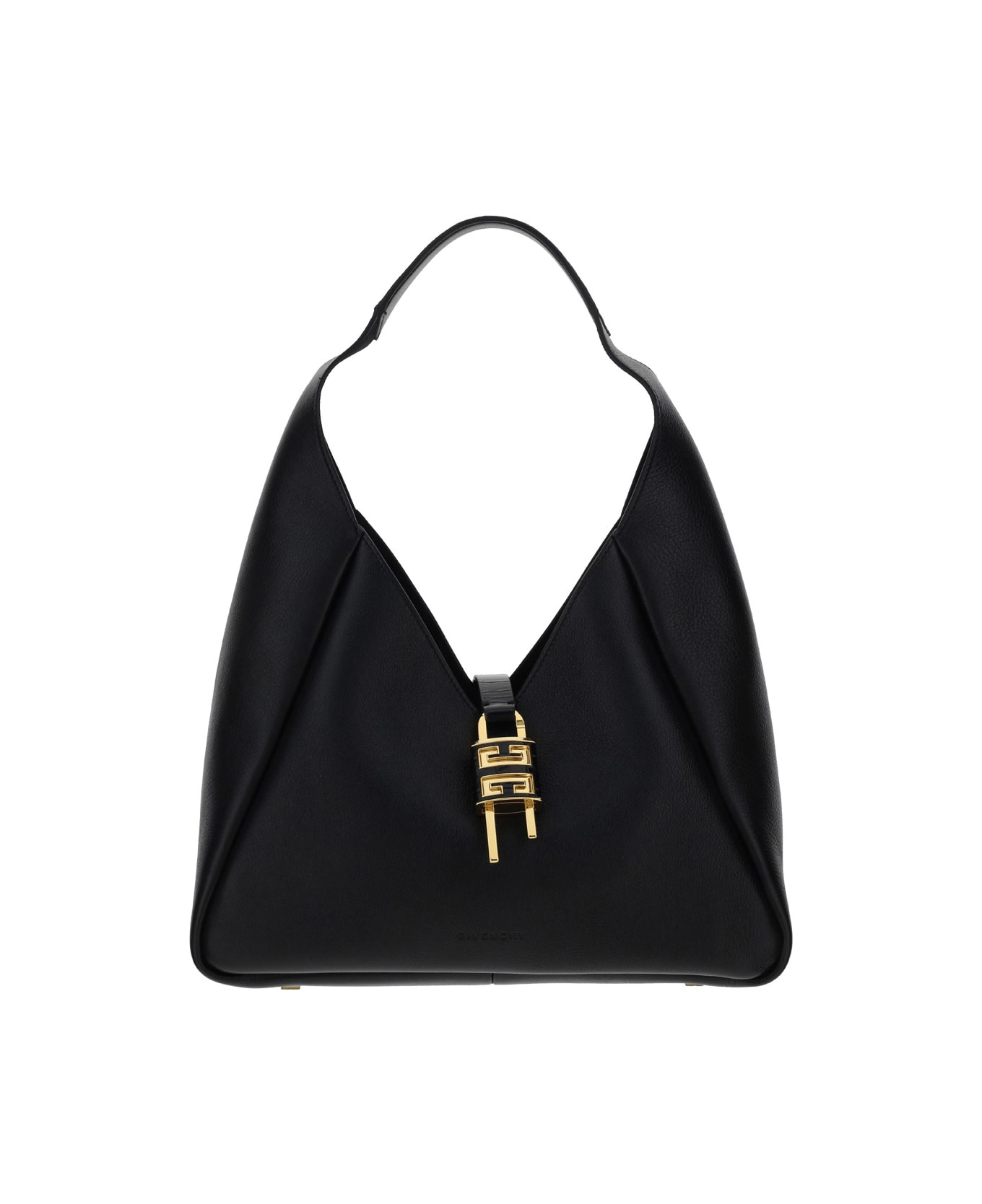 Calfskin medium hobo shoulder bag by givenchy, flat top handle, crocodile-embossed leather band closure, gold-plated 4g padlock, applied feet as support at base of bag, interior welt pocket, suede lining.