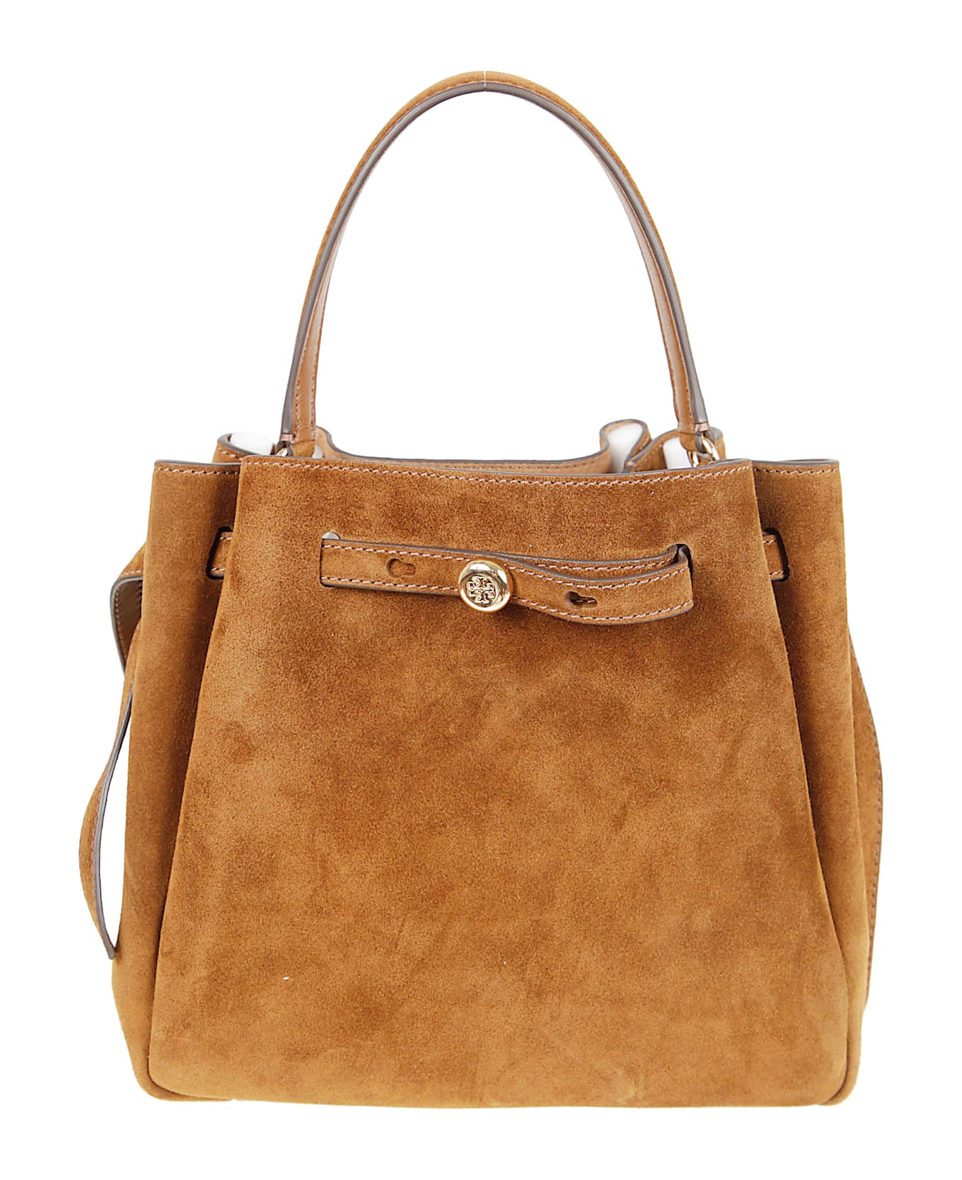 Soft bucket shoulder bag. Made of suede, featuring a single handle, gold-tone buckle, and side lace closure. Metal Tory Burch Double T logo, interior patch pocket. Magnetic closure, removable and adjustable shoulder strap.