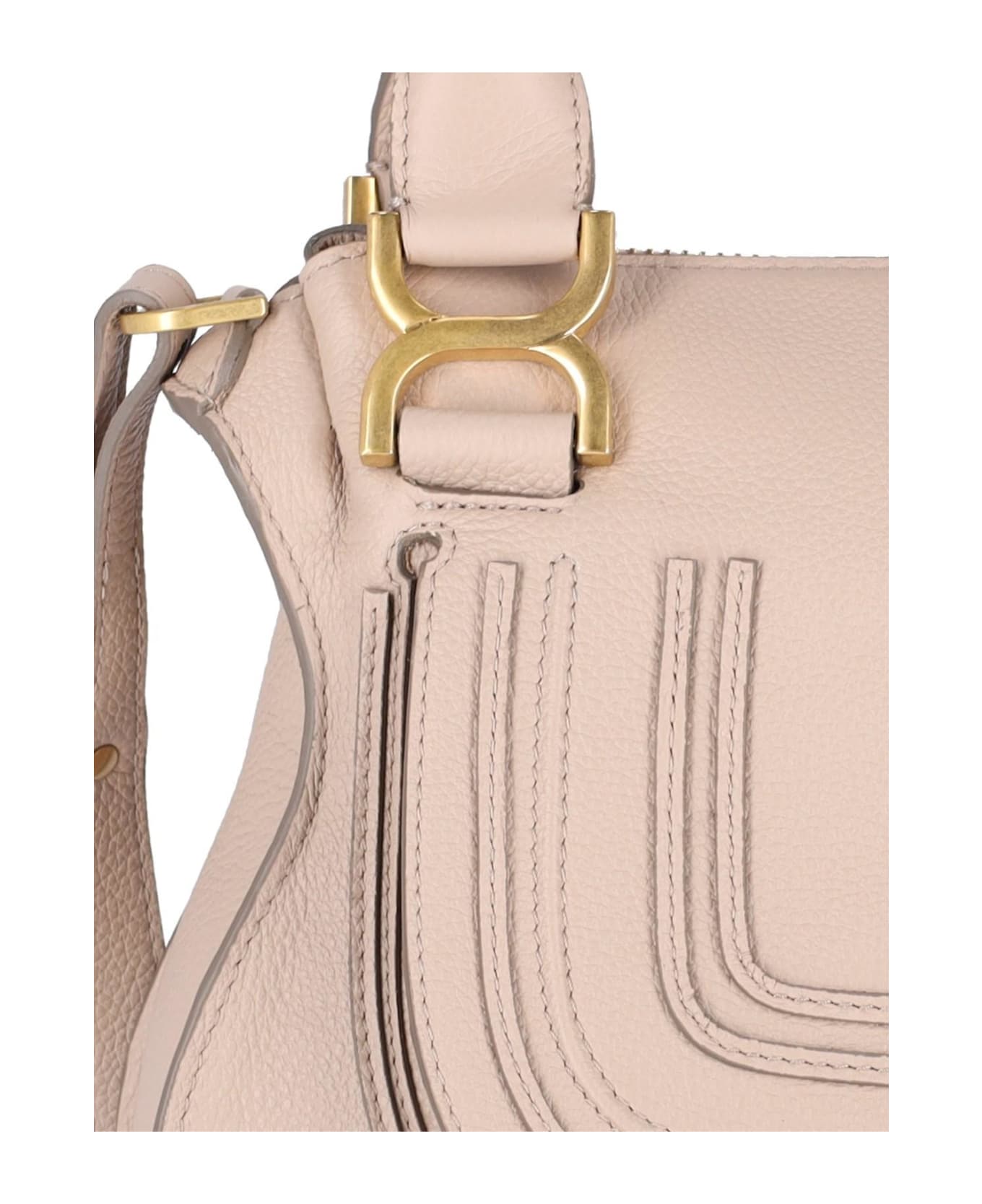 Chloé Small Hand Bag 'Marcie', pink leather, two top handles, removable adjustable shoulder strap, top zipper closure, contrasting profiles front, embossed logo front, gold metallic charm and tassel front, one internal compartment.