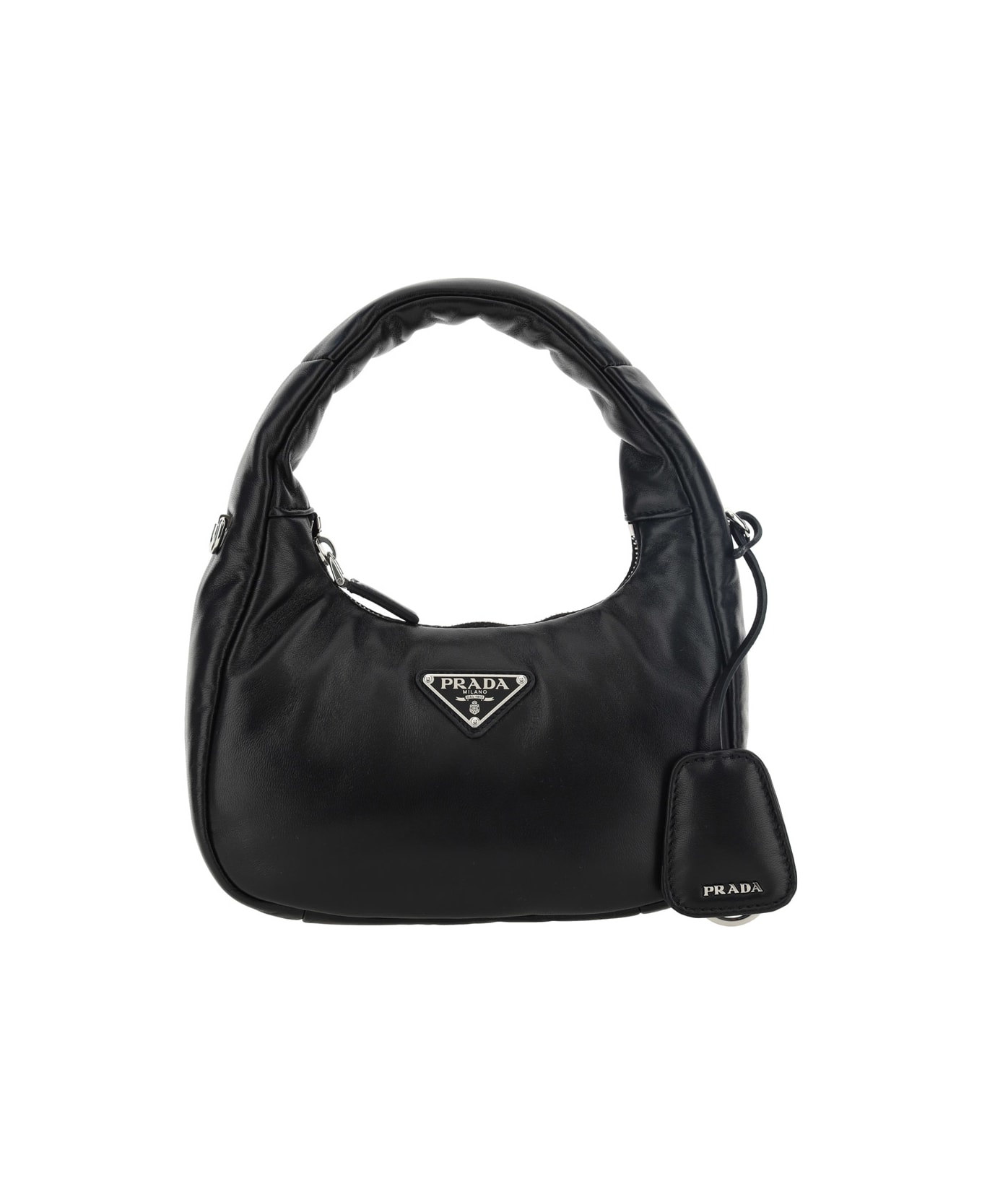 Lambskin soft handbag by prada, unique padded design, an iconic triangular enamel plaque with brand signature applied to the front, an applied plaque detail to the handle with key ring, a top zip fastening, and a removable and adjustable flat shoulder strap. Composition: 100% % Lamb Ovis Aries Aries