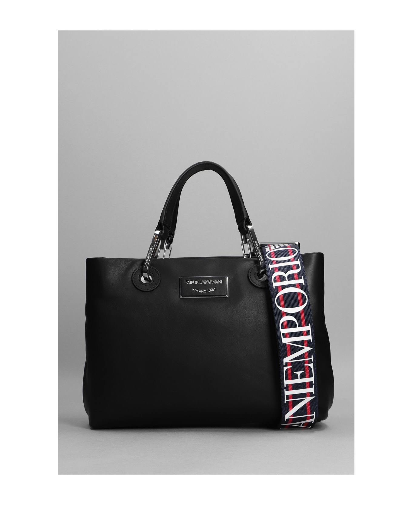 Tote in black leather, Height 195 mm, Width 260 mm, Height 195 mm, double handle, adjustable fabric shoulder strap , silver hardware, logo plate, 100% leather, Made in China