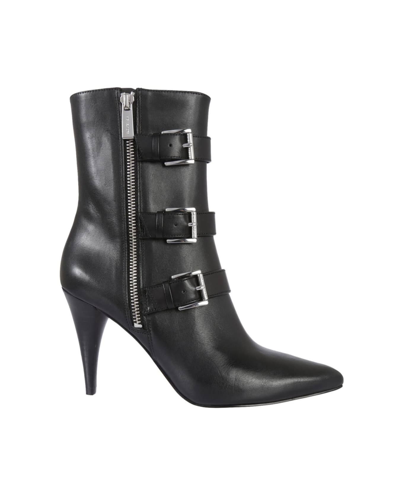 Lori Leather Ankle Boots from Michael Kors: Black Lori Leather Ankle Boots with pointed toe, flat outsole, silver tone hardware and zip closure.