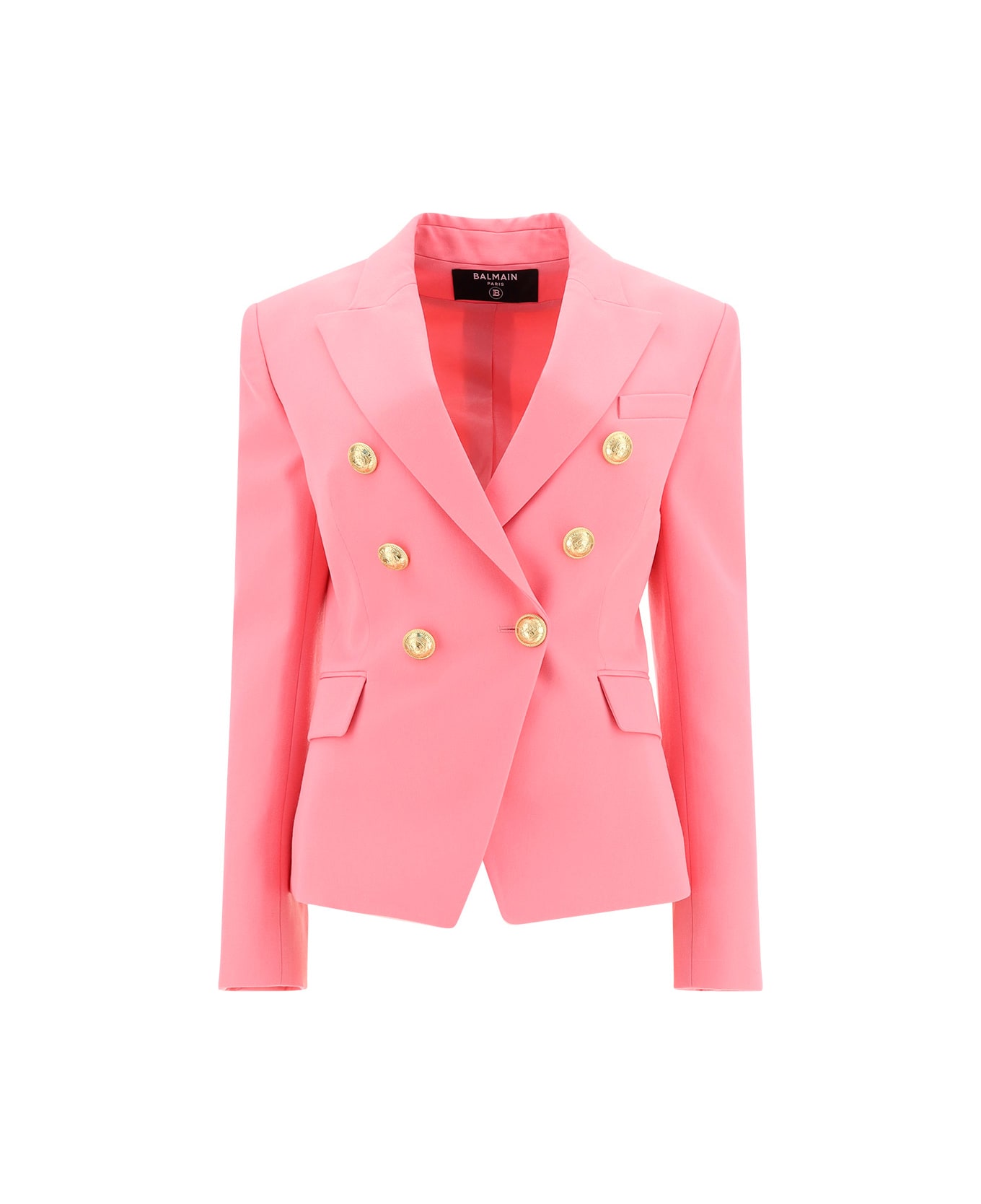 Wool blazer jacket by balmain, double-breasted front fastening with gold-plated and embossed contrasting buttons, peaked lapels, two welt pockets with side flaps, one front welt pocket, fitted and slouchy design, structured shoulders, regular fit.