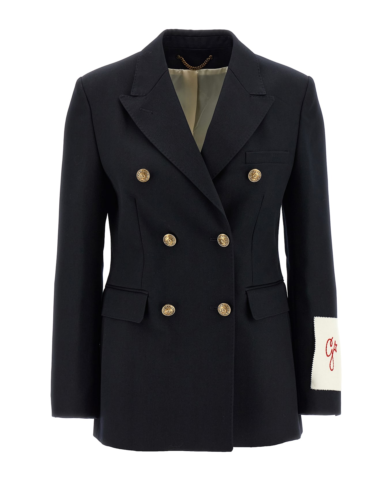 'Diva' double-breasted virgin wool blend blazer with front metal button closure, peak lapels, breast pocket, flap pockets, structured shoulder strap, long sleeves with embroidered logo patch, back vents, viscose blend lining and monogram cupro.
