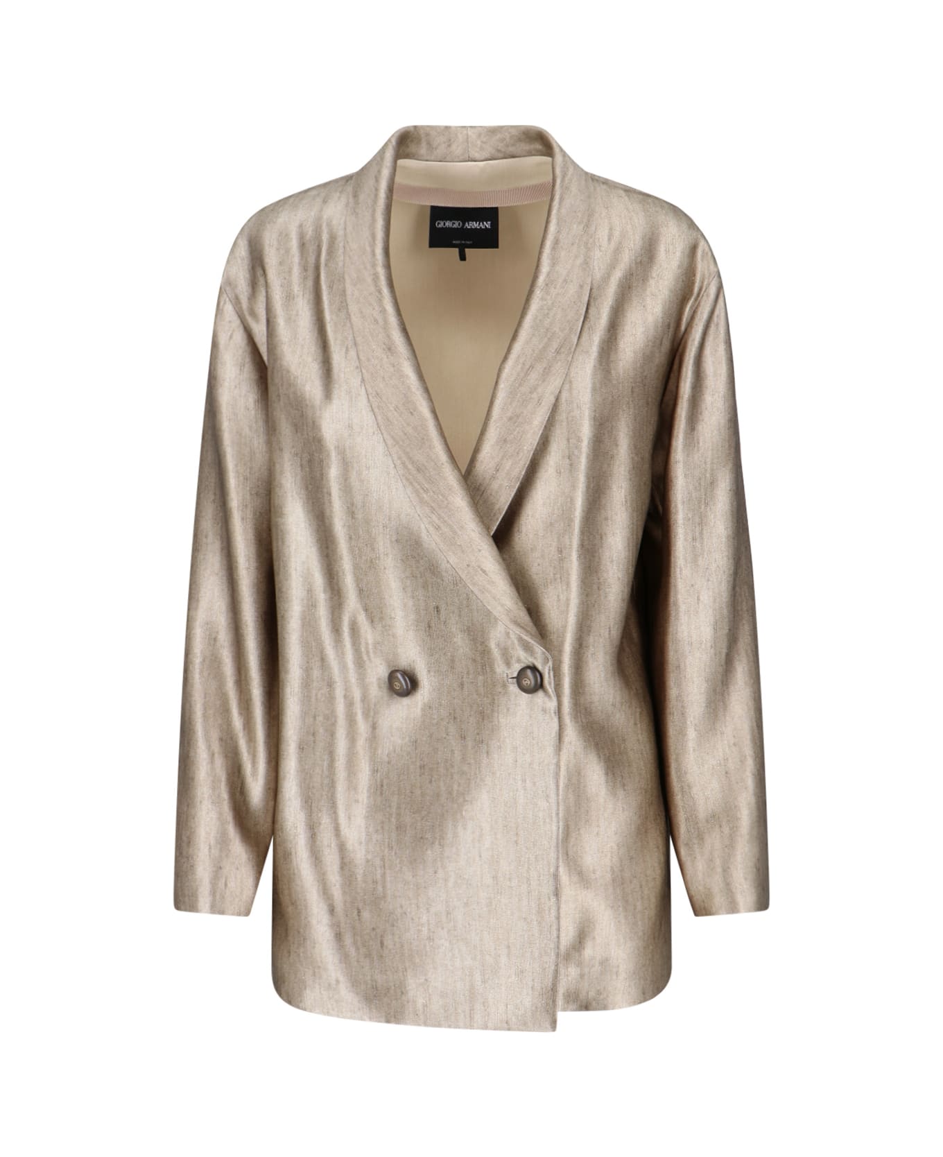 Double-breasted blazer in gold Giorgio Armani silk with peak lapels, button closure, logo detail engraved on buttons, straight hem.