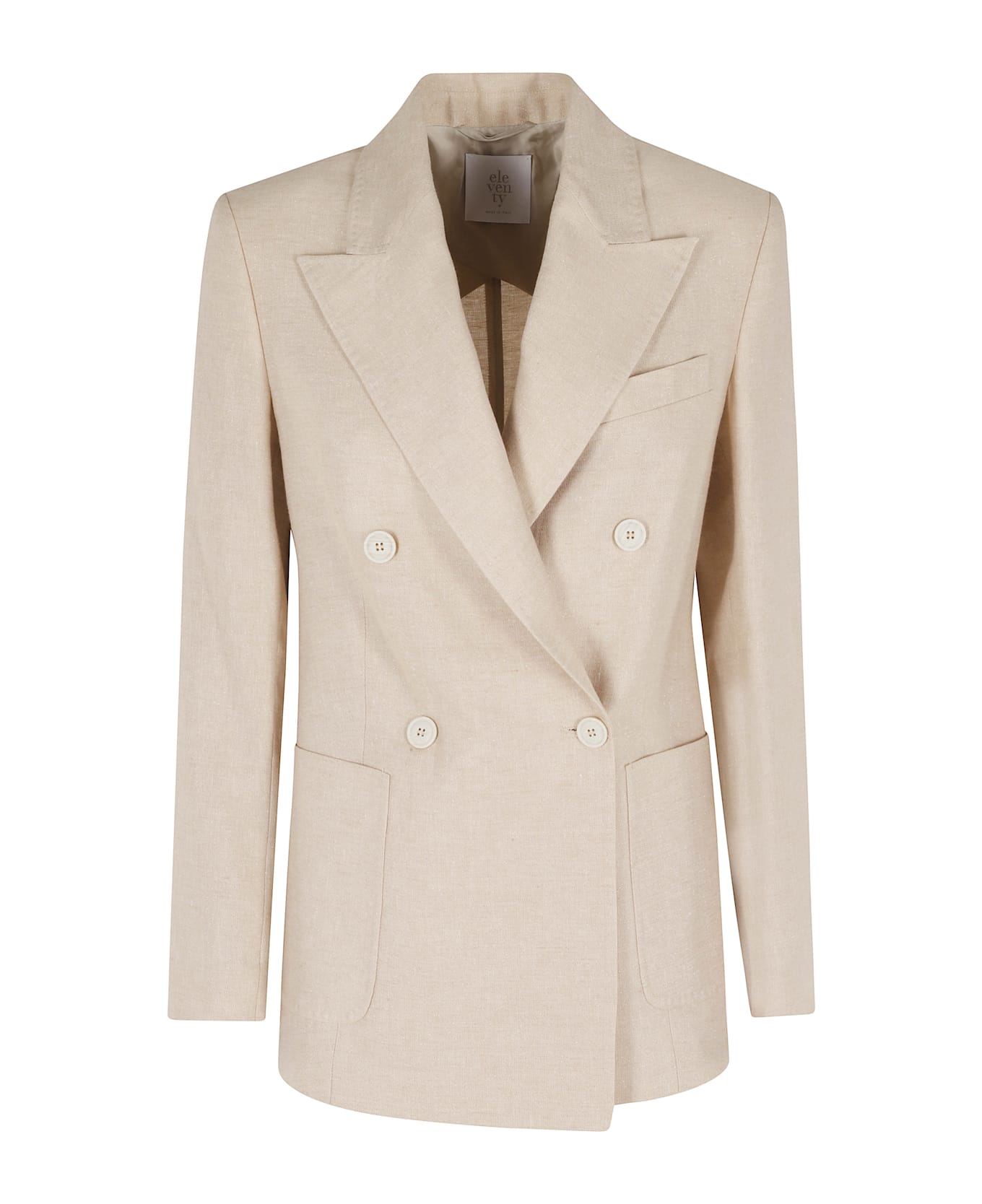 Category: Jacket - Blazer Item: Double-breasted blazer Brand: Eleventy Color: Beige Neckline: Peaked lapels Pockets: Chest pocket and two flap front Details: All-over glitter effect Closure: Double-breasted SIZE AND FIT Fit: Regular Sleeve length: Long