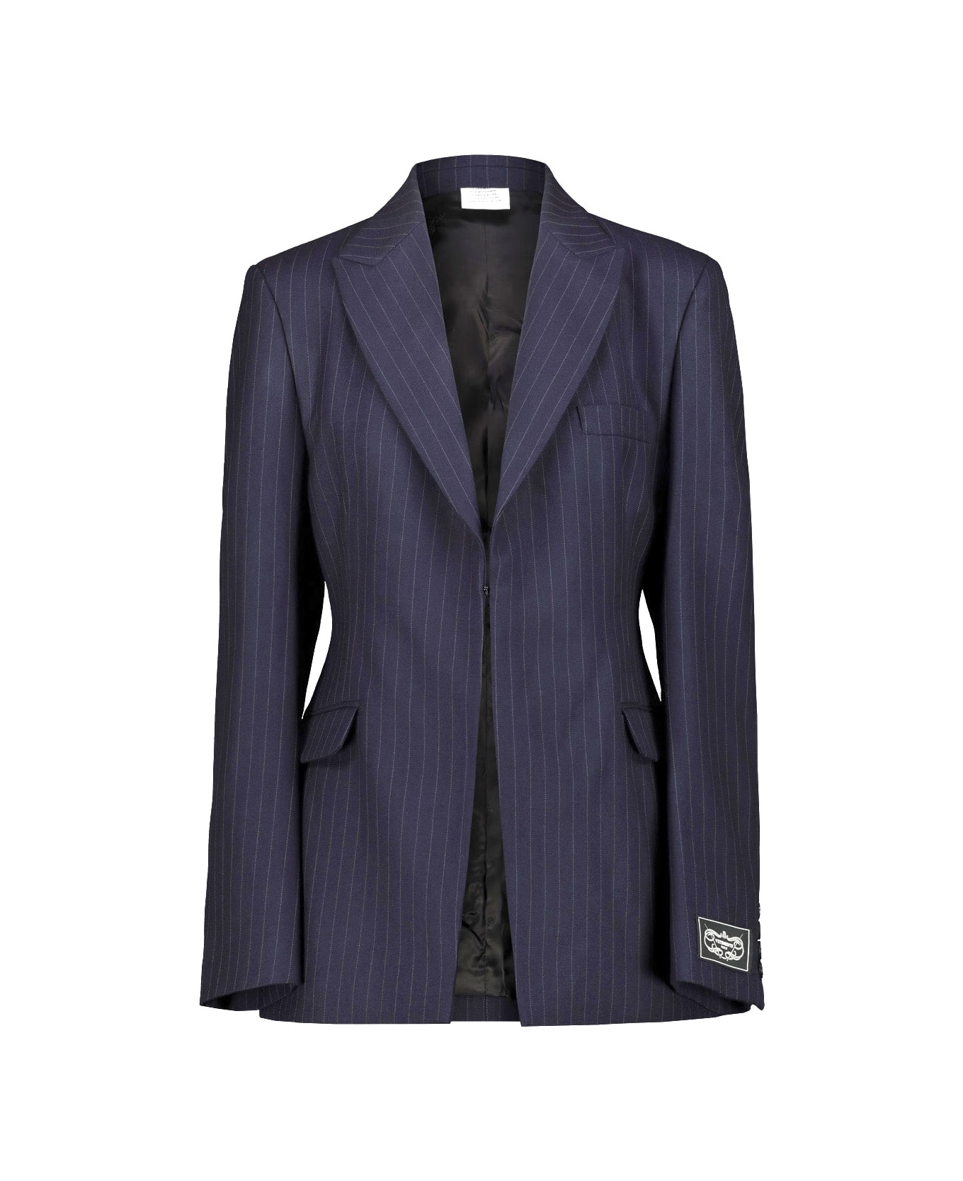 VETEMENTS blue pinstriped wool hourglass jacket, concealed hook fastening on the front, side slits on the back. GTIN code: WA65JA738N