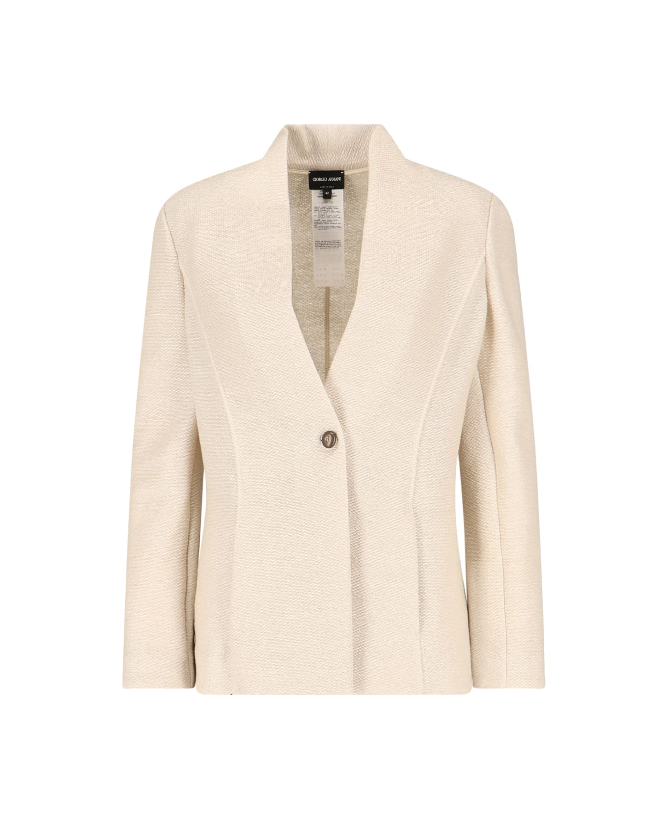 Giorgio Armani single-breasted blazer in cream cotton blend with long sleeves, button closure, two side pockets, back split detail, straight hem. Composition: 56% Cotton, 44% Polyamide