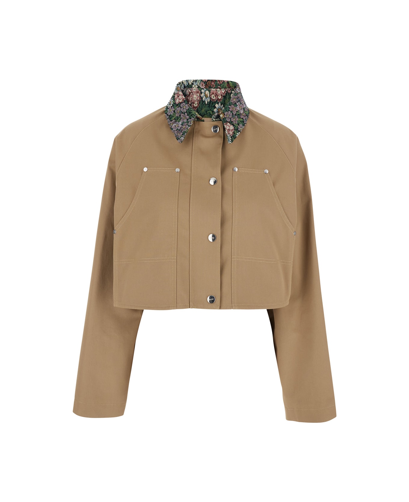 Beige jacket with front closure and side pockets. It features a classic collar and long sleeves. The back is characterized by a simple finish without details. Made of cotton. Regular fit.