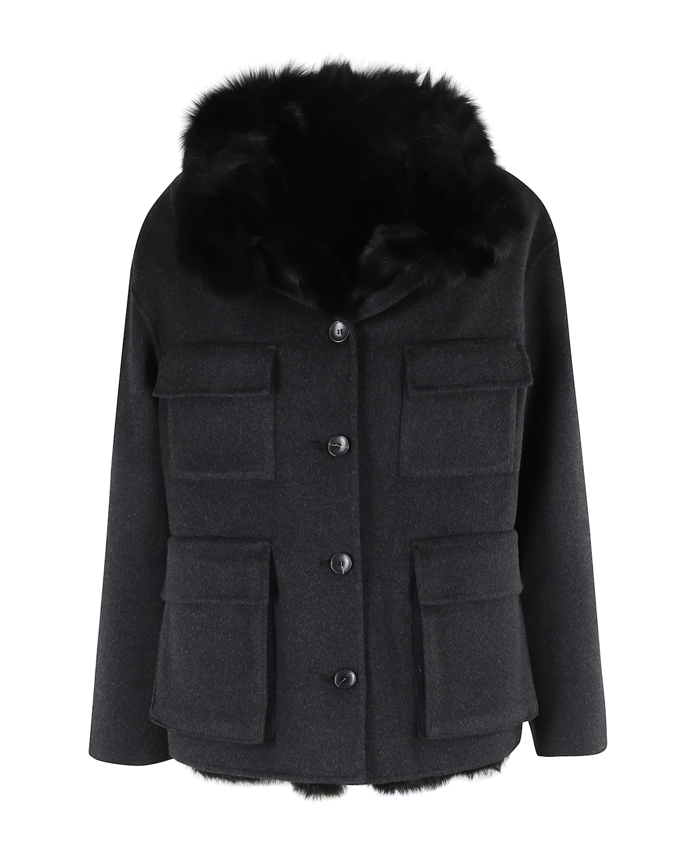 Coat - Seventy - Anthracite color - Wool fabric - Faux fur collar - Front flap pockets - Front button closure