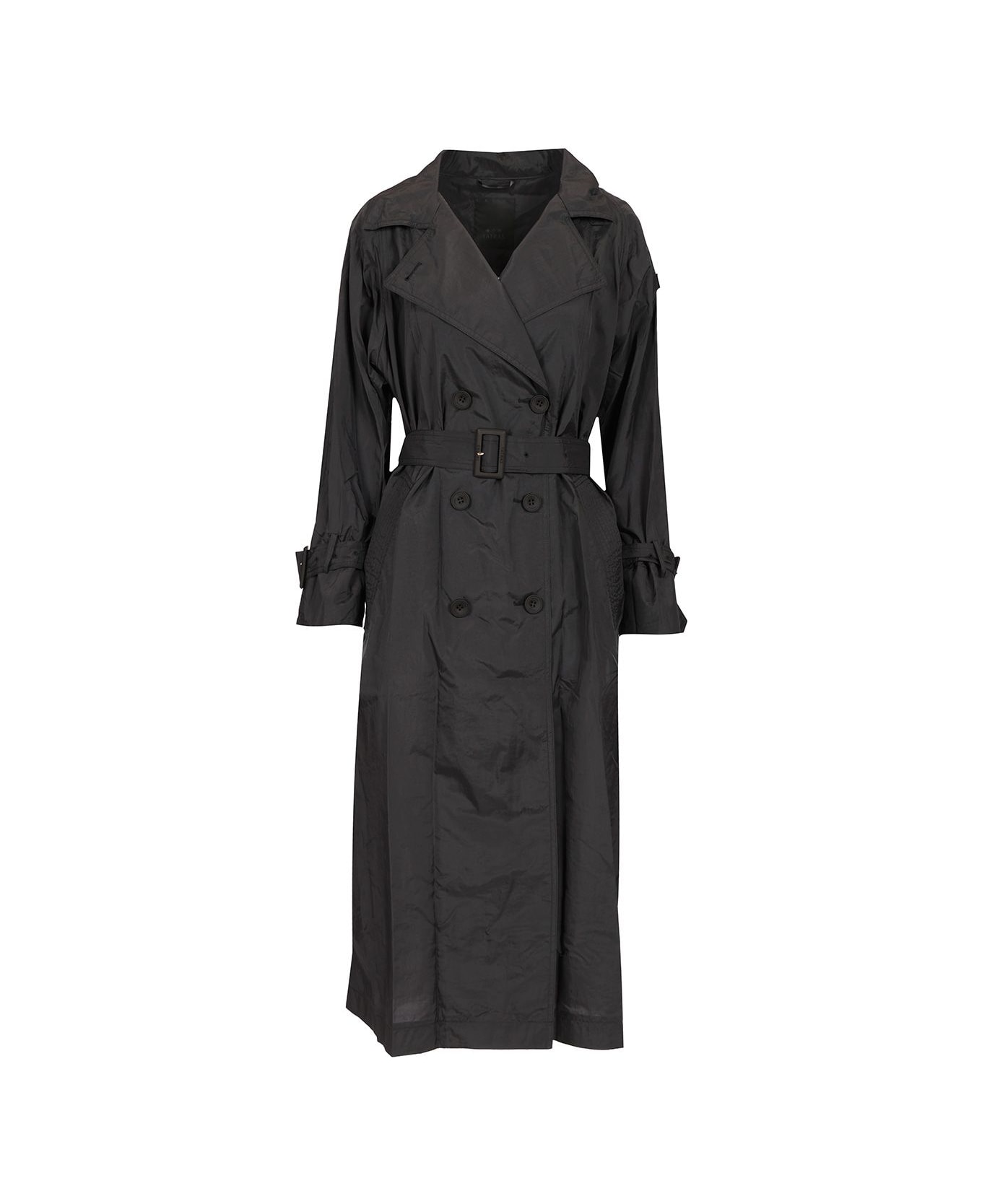 "Ligaris" ultralight nylon trench coat by Tatras, with regan collar and waist belt, double-breasted button fastening and tone-on-tone buckle