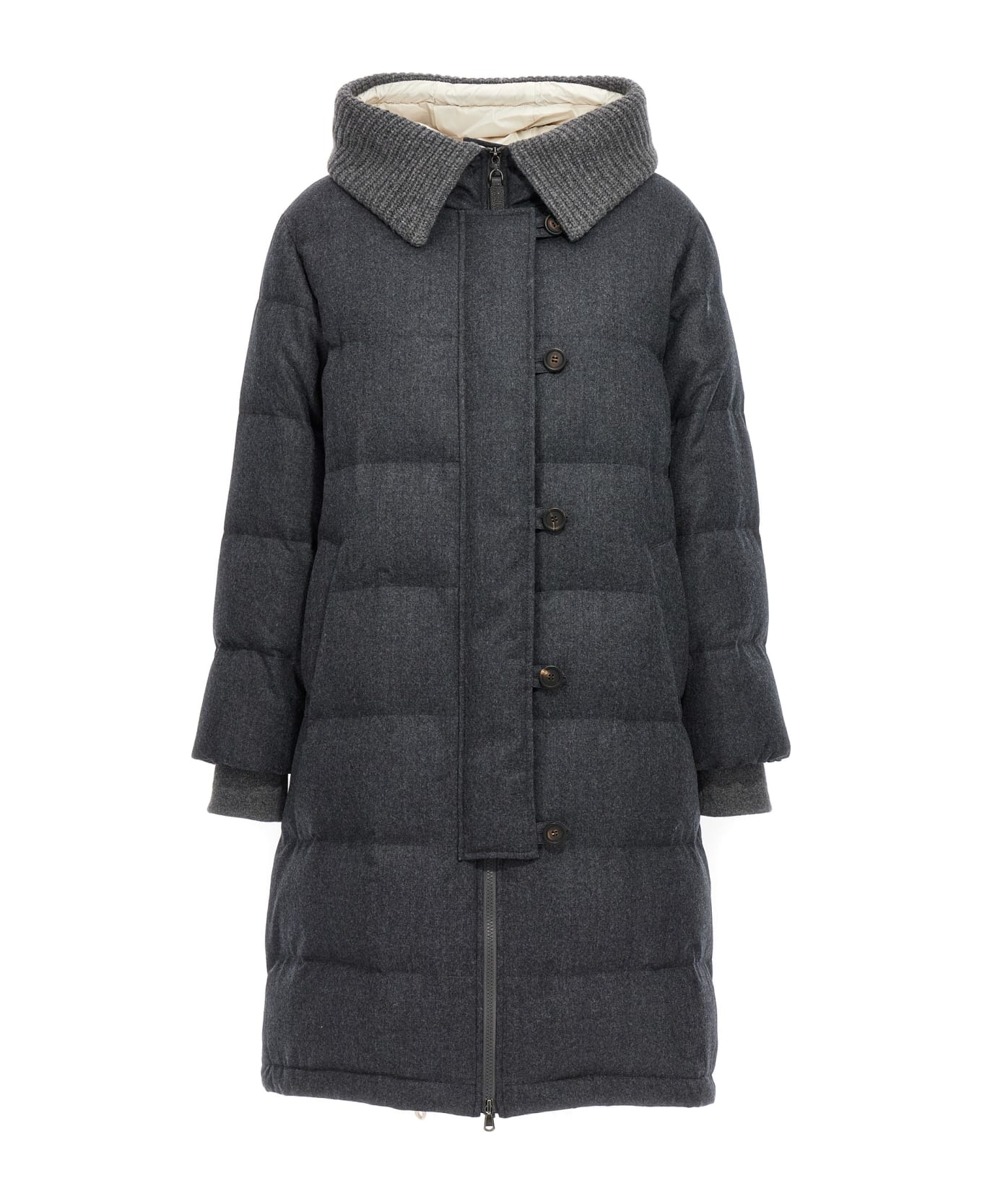Long hooded down jacket in wool with lining and down padding, zipper and button closure, long knitted cuffed sleeves, pockets, back split, and adjustable drawstring on the hem. Composition: 100% virgin wool