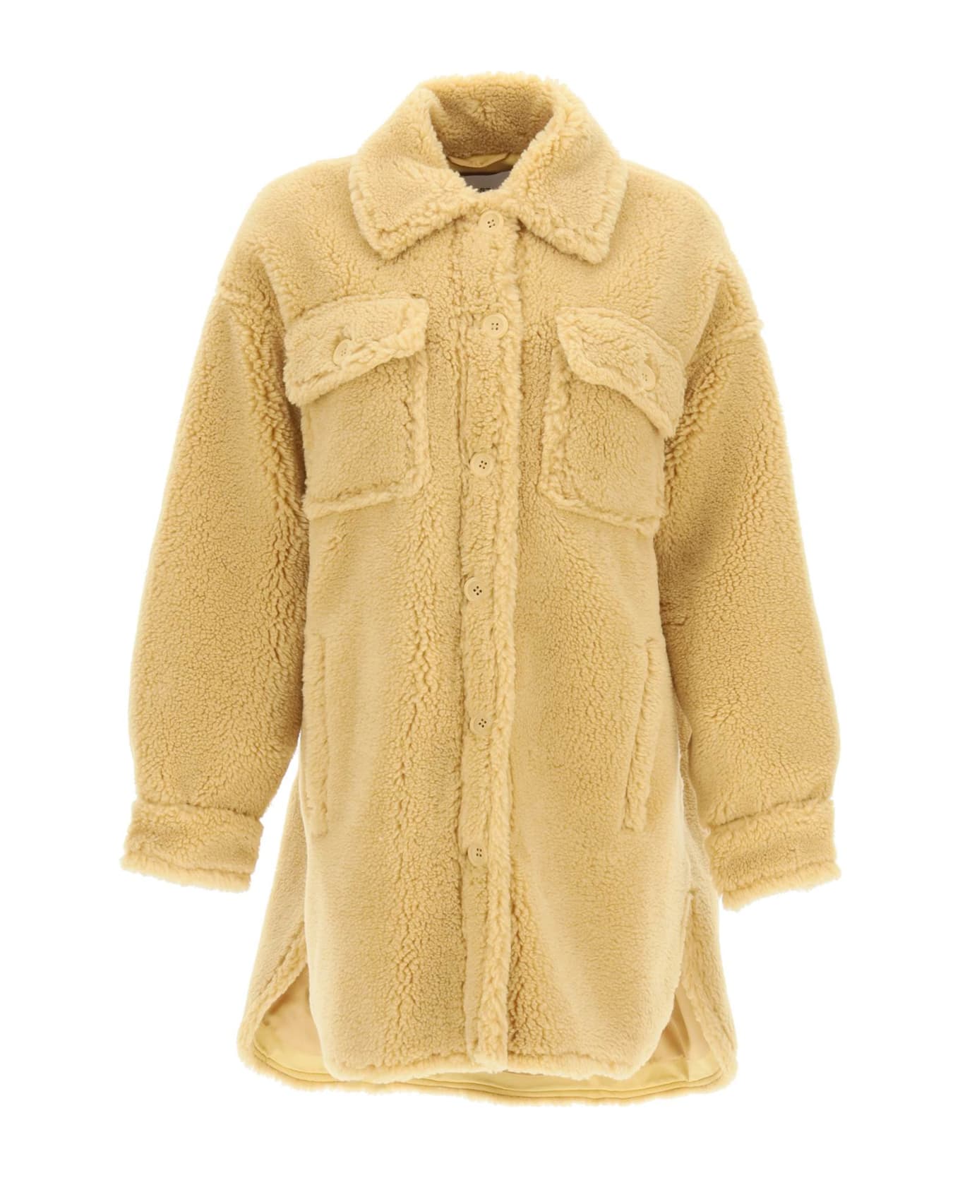 Stand Studio shirt-cut jacket made from warm wool-blend faux fur with an oversized fit. It features a classic pointed collar, front button placket, patch flap pockets on the chest, side slit pockets. Low set-in sleeves, a snap button at the cuffs. High-low hem with rounded side slits. Twill-lined interior with a zip pocket. The model is 177 cm tall and wears a size FR 34.