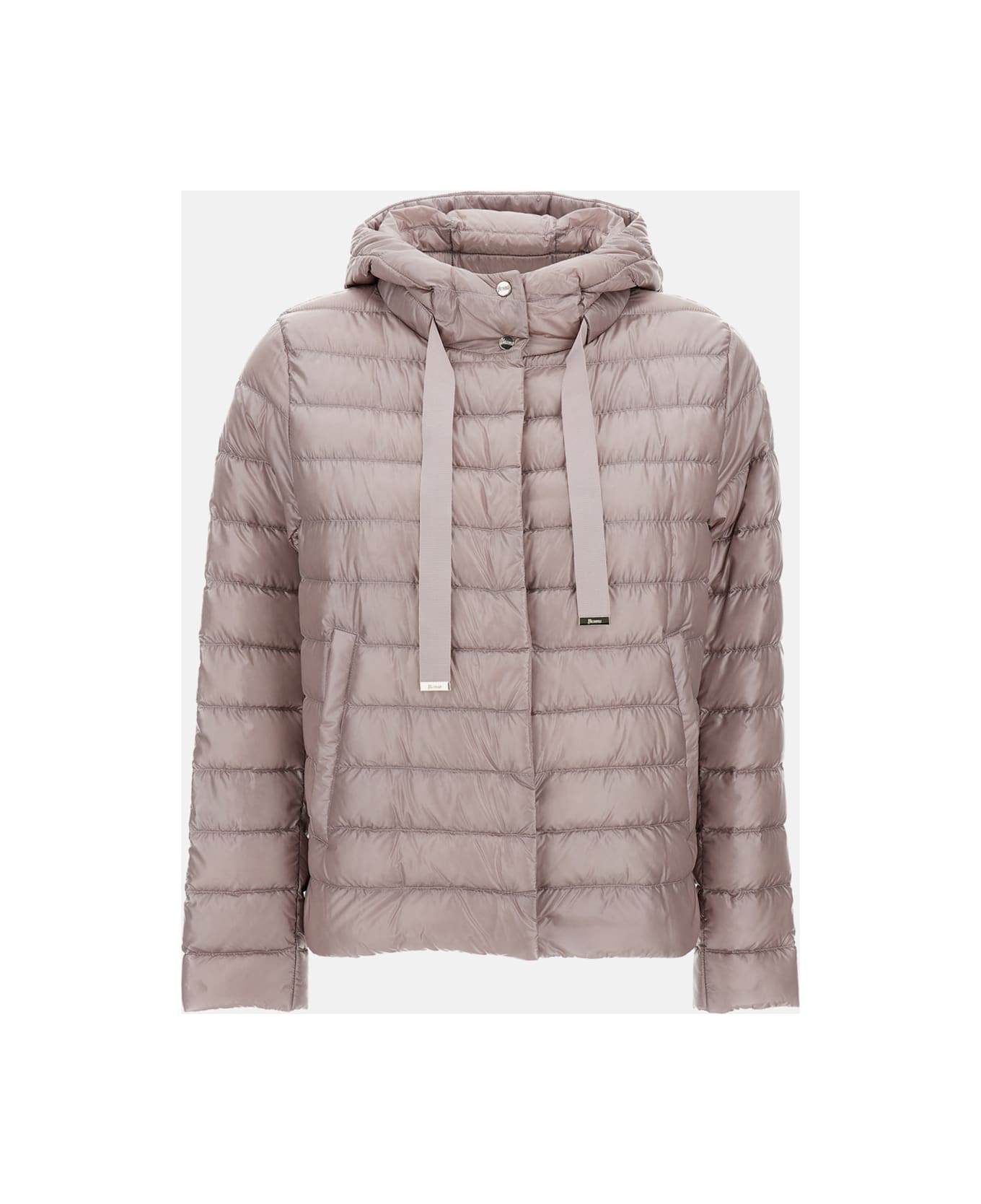 Hooded down jacket with adjustable drawstring Front fastening with snap buttons Side welt pockets Quilted construction Pink Composition: 100% Polyamide