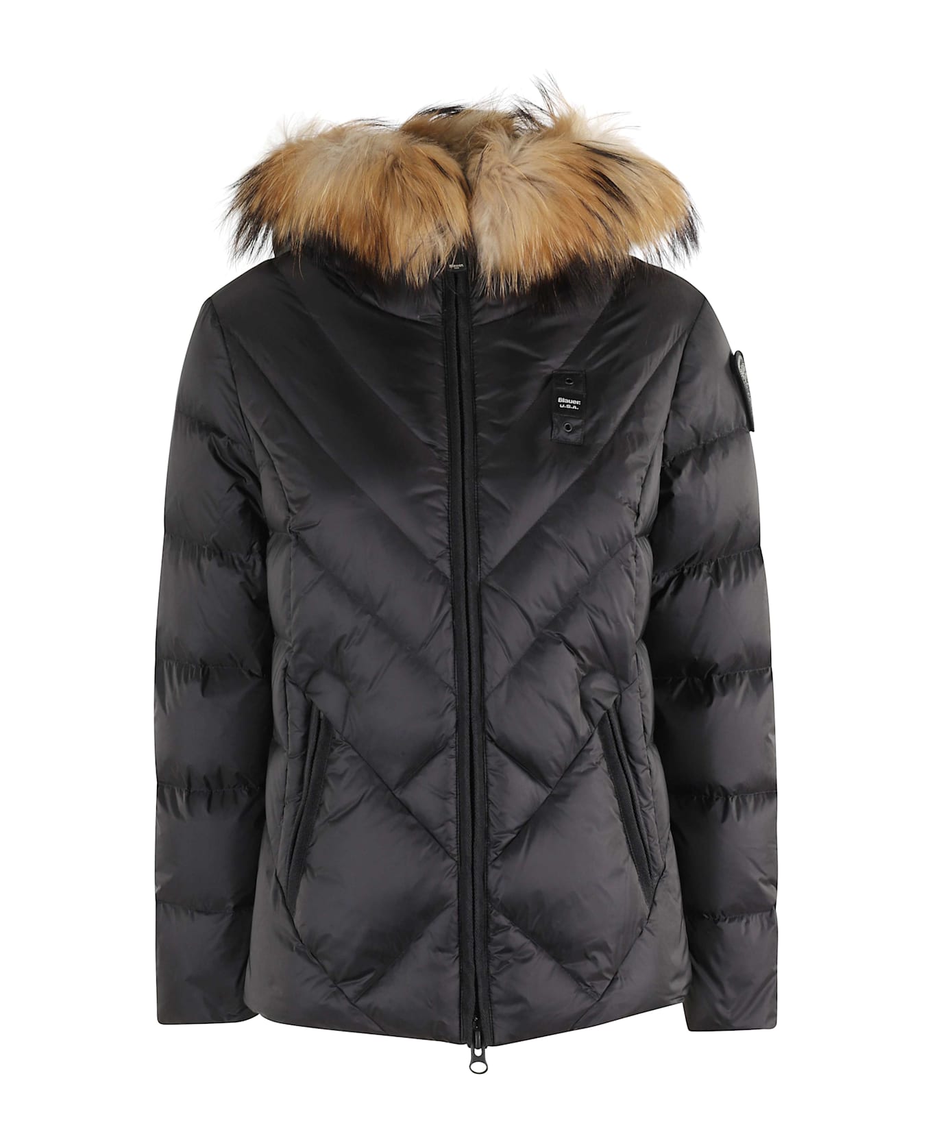 Alicia down jacket - Blauer - Black color - Quilted waterproof fabric - Hood with removable fur trim - Logo on left sleeve with rhinestones - Side zippered pockets - Short model - Front zipper closure.