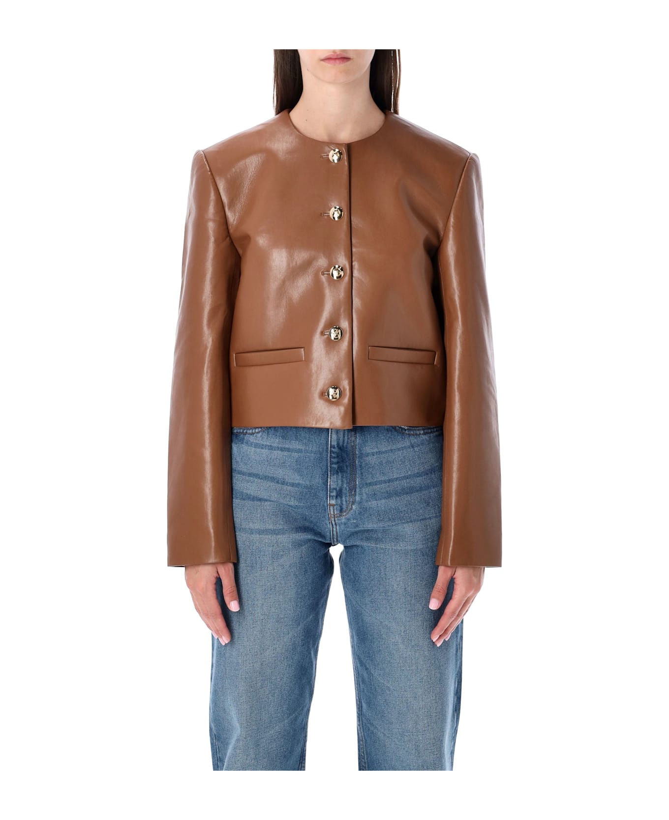 This Anine Bing Jacket Is Crafted From Smooth Leather In A Rich Cognac Shade, Showcasing A Modern Cropped Silhouette. Designed With A Round Neckline, Structured Shoulders, And Front Button Closure With Gold-tone Details, It Blends Minimalism With Statement Appeal. Front Welt Pockets And Buttoned Cuffs Complete The Design, Making It A Versatile Piece To Pair With Denim Or Tailored Trousers For An Elevated Everyday Look. Round Neckline Long Sleeves With Buttoned Cuffs Cropped Silhouette Front Button Closure With Gold-tone Buttons Front Welt Pockets Smooth Leather Construction Alessandra Is 1,75 M And Wears Size S