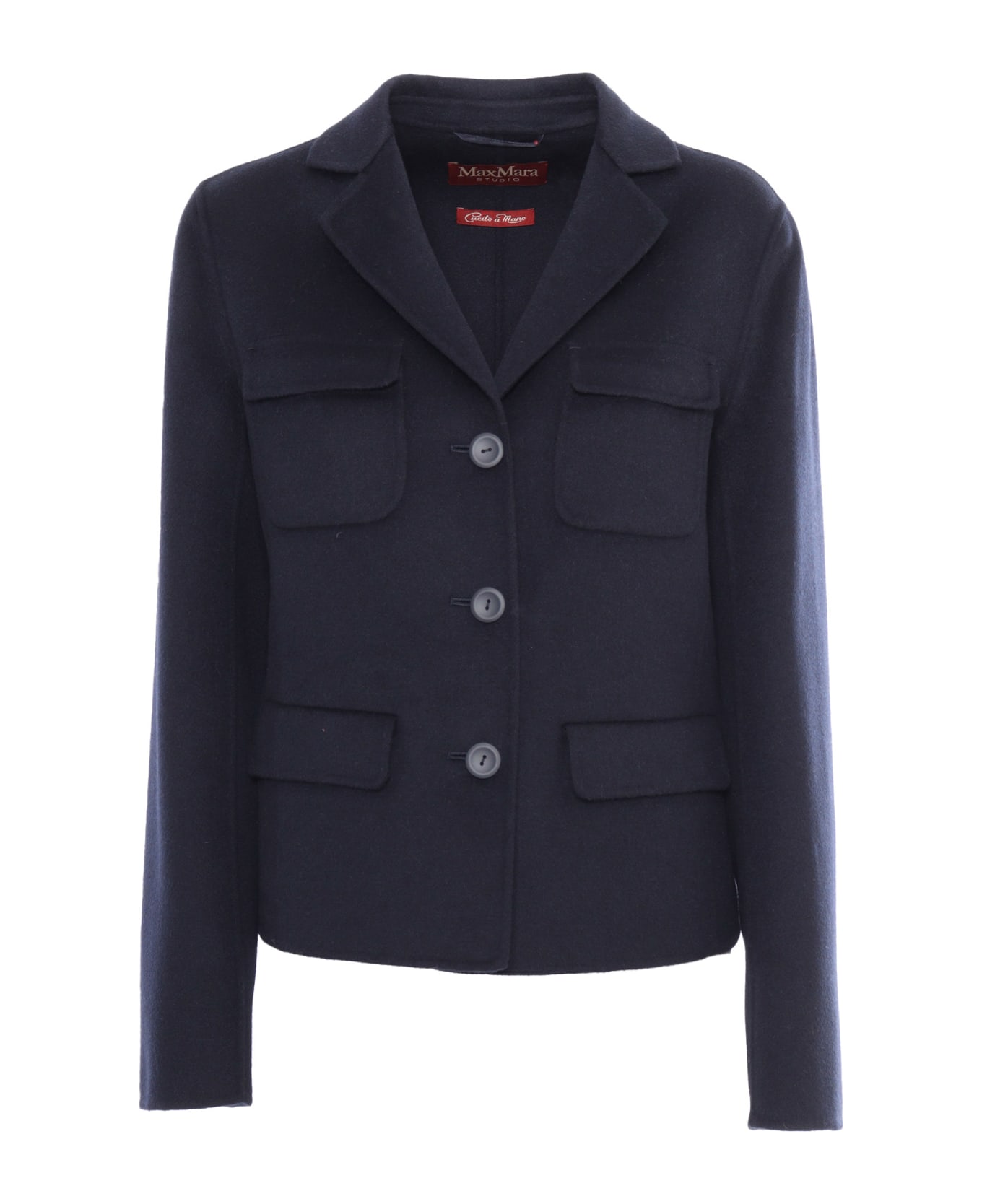 Blue Grecia jacket in wool blend with flap pockets on the front, lapel collar, front buttoning. Composition: 88% Virgin wool 6% Silk 6% Cashmere Lining 100% Polyester
