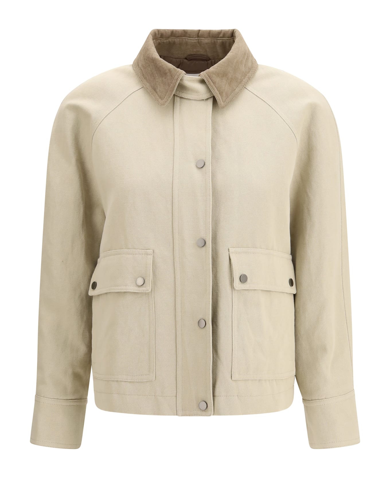 The cotton-linen canvas jacket by brunello cucinelli blends refined materials with thoughtful functionality. its slightly structured, relaxed silhouette enhances the natural appeal of the canvas fabric, offering a versatile layer with understated sophistication. a contrast-tone classic collar elevates the design, while the generous flap pockets with snap buttons nod to the world of utilitarian tailoring. finished with a double closure, adjustable cuffs, and technical lining, it is crafted to accompany the season with comfort and elegance.