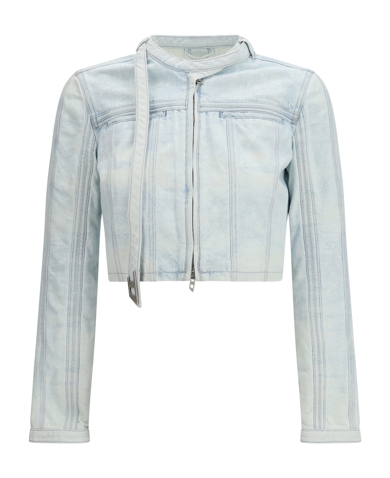 The de-saphix-fsi1 jacket by diesel, unveiled during the ss26 runway show, fuses biker codes with a sleek racer attitude in a slim, cropped silhouette. the round collar extends into a long wraparound strap fastened with a logo button and finished with a metal d detail, adding a distinctive signature touch. crafted from innovative satin denim in a cotton and hemp blend, the fabric features a luminous surface enriched with ultra-fine metallic threads. laser treatments create bold contrasts between matte and glossy areas, while a hand-sprayed coating and sulfur-based pigments generate sophisticated grey tones with a unique worn effect. a convex d-logo button encased in transparent resin adds a jewel-like accent, complemented by an embossed leather back label. complete with a d-logo zip closure, welt chest pocket, and lyocell lining, this jacket embodies diesel s experimental craftsmanship and contemporary edge.