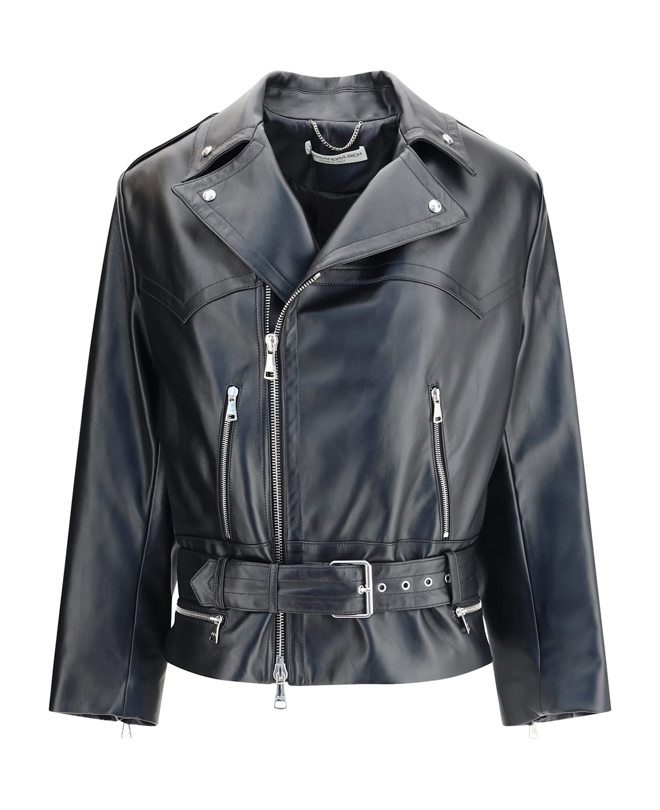 The alessandra rich leather biker jacket is a garment with a strong character and timeless style. featuring wide lapels and a side zipper closure, it has two zippered welt pockets, an elasticized back waist and a matching, removable, buckle-adjustable belt. a perfect blend of grit and femininity.