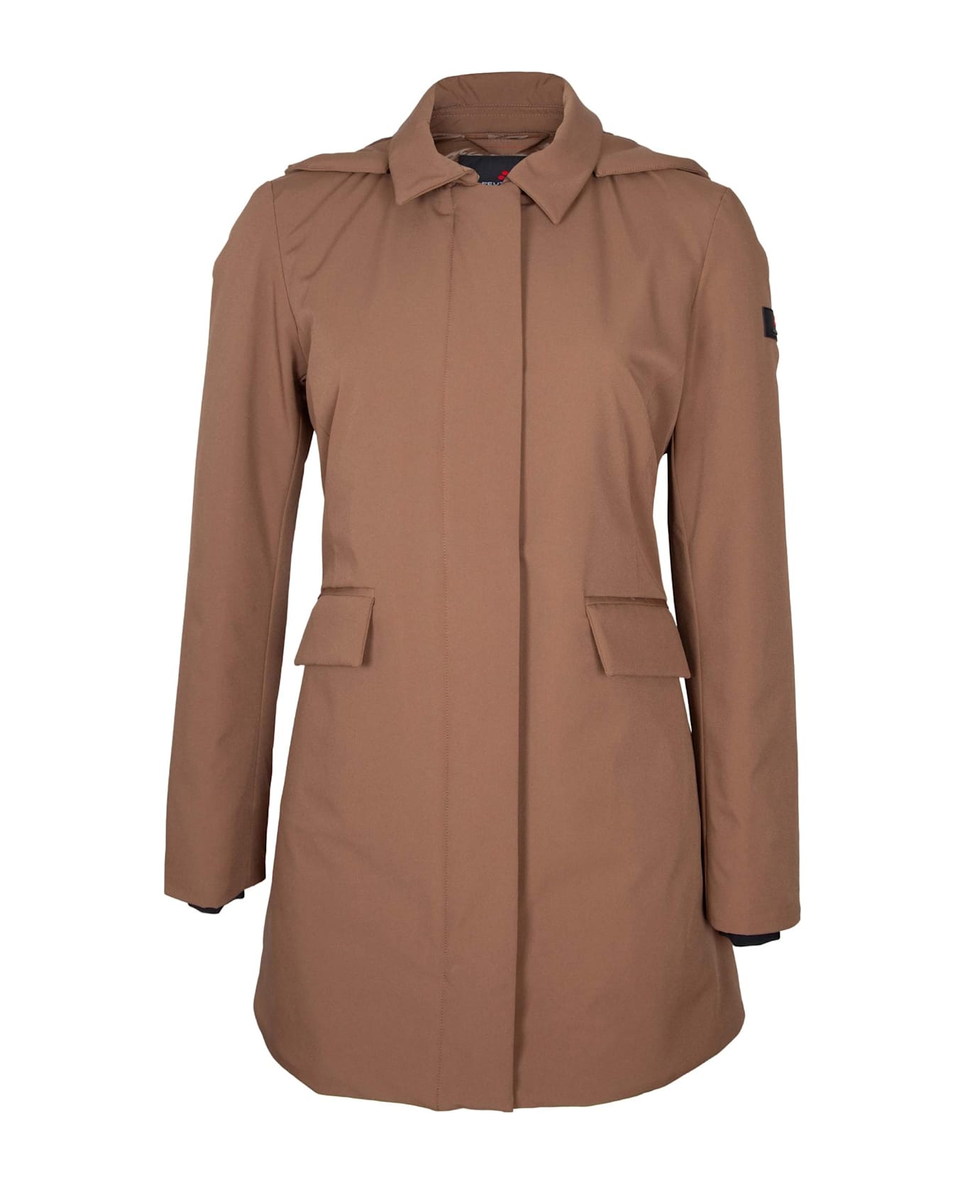 Telia ta 02 nylon jacket brown three-quarter length waterproof, four-way stretch nylon fabric for optimal comfort interior with polyamide quilting and light synthetic padding removable collar and hood two-way closure with covered snaps front welt pockets with flaps logo tag sewn on the sleeve regular fit composition: 87% polyamide, 13% elastane