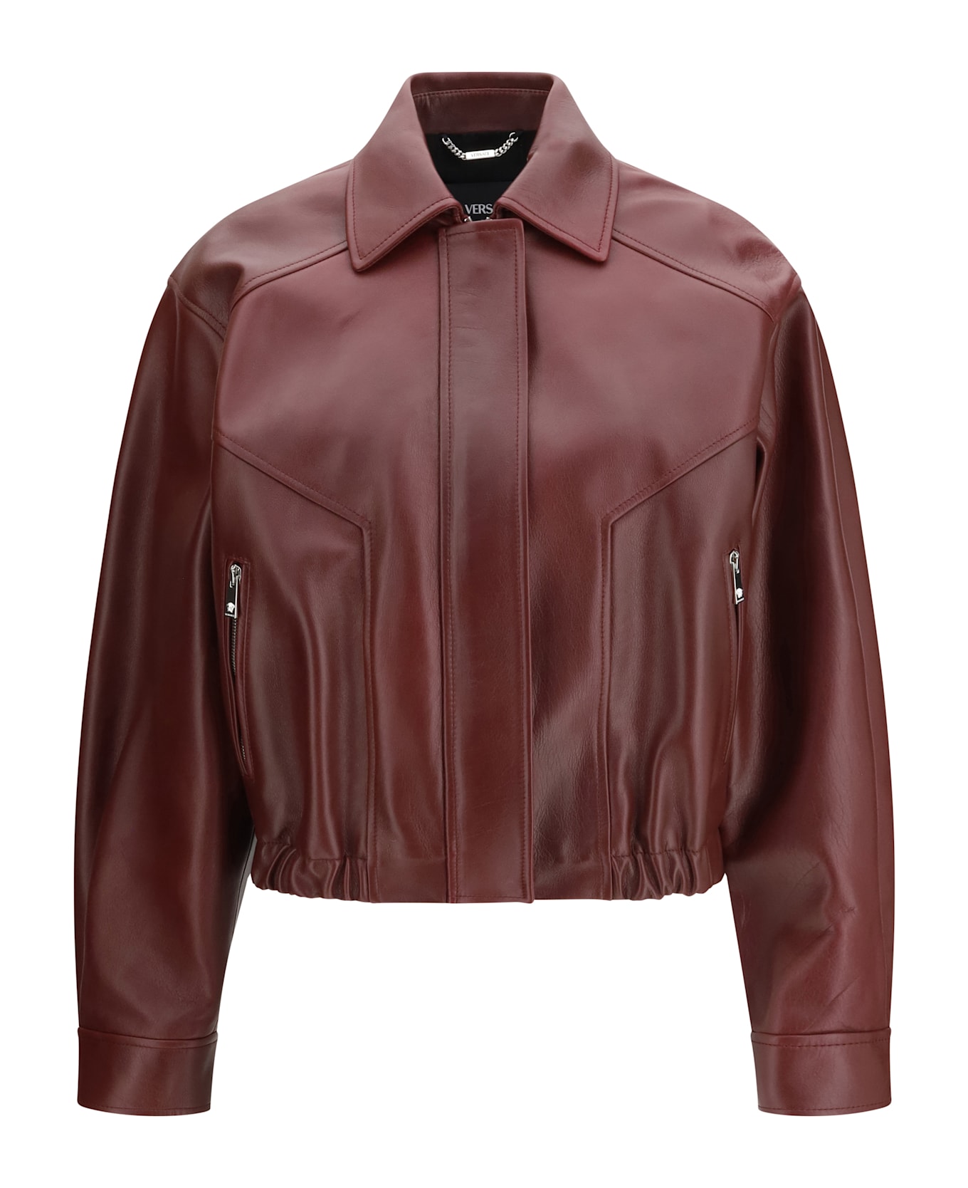 The leather jacket by versace is an iconic piece that combines boldness and sophistication. the medusa buttons, symbol of the brand, embellish the design, while the long sleeves and pointed collar add a touch of structured elegance. the concealed zip and snap button front closure ensures practicality and a clean look, while the zipped side pockets and elasticated waist offer comfort and functionality. snap button cuffs complete the look, making this jacket a perfect blend of sophisticated style and distinctive details.