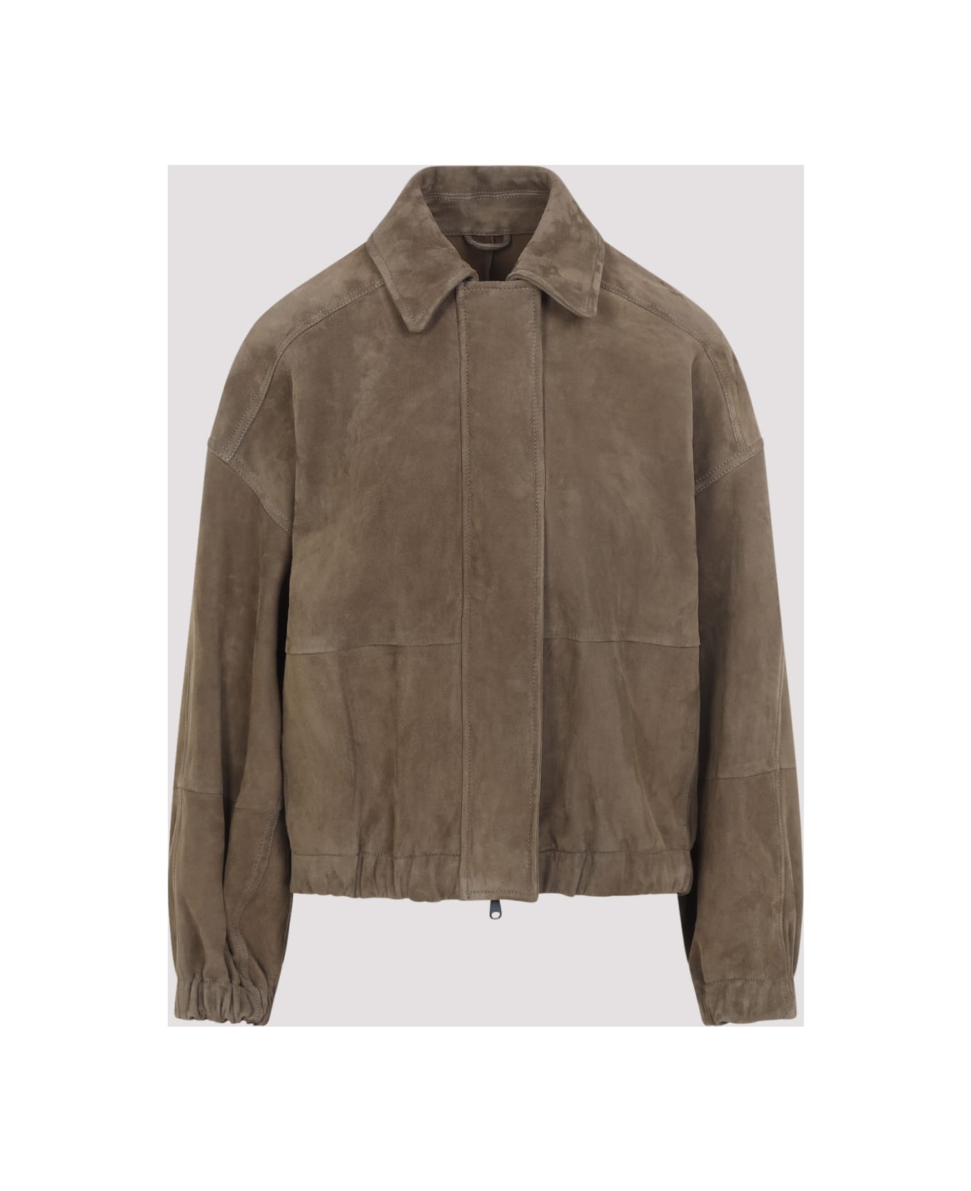 Brunello Cucinelli Oregano Brown Suede Leather Jacket. Pure oregano brown suede leather jacket, pointed collar, front concealing zipped fastening, side pockets, dropped shoulders, long sleeves, elastic cuffs and hem, straight hem.