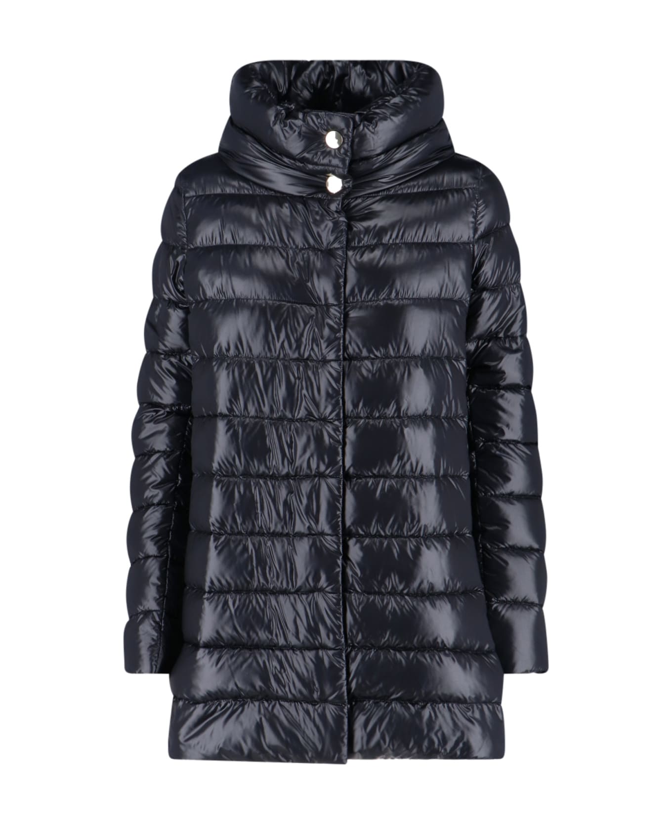 Herno "Amelia" coat in black nylon with quilted and padded design, high neck, button closure, silver metal logo tag on the back, straight hem. Composition: 100% Polyamide