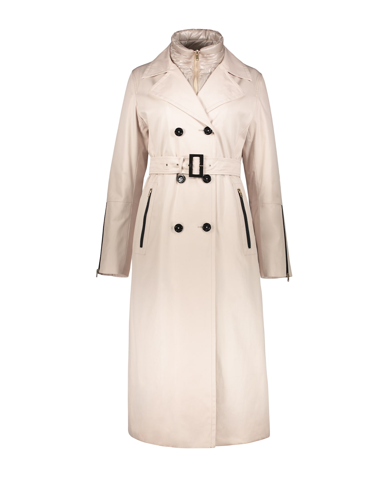 This long trench coat features an elegant and refined neutral tone. made from a durable fabric, it has a double-breasted closure with buttons, which gives it a classic and sophisticated look. it has a removable padded technical fabric panel, and the long sleeves and high collar provide comfort and protection, while the side pockets add functionality and practicality. this versatile outerwear piece pairs easily with various outfits, from casual to more formal ones.