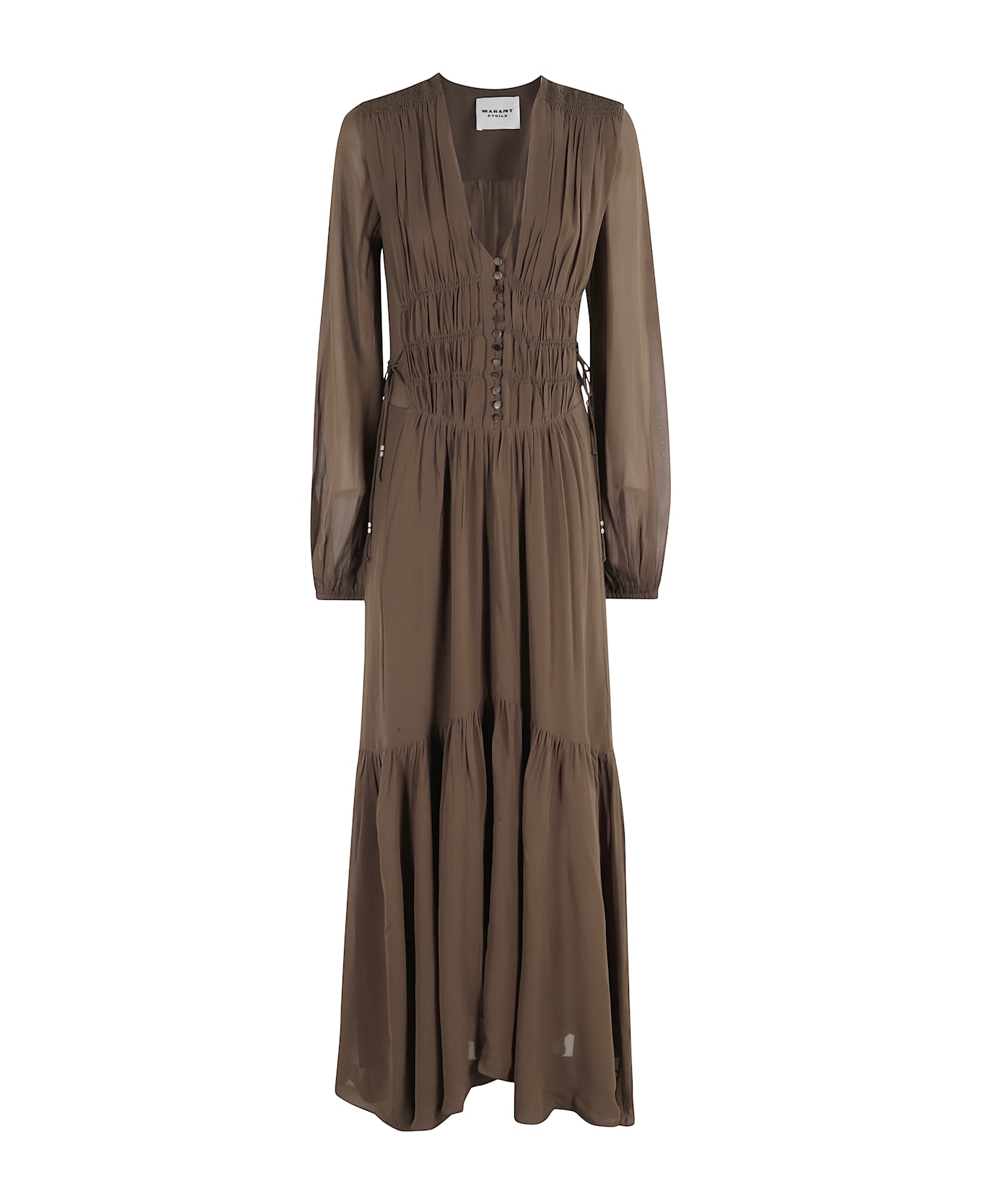 Briane dress - Marant Etoile - Khaki color - Georgette fabric - V-neck with buttons - Long sleeve - Draped design - Drawstring at waistband - Long flounced skirt - Regular fit