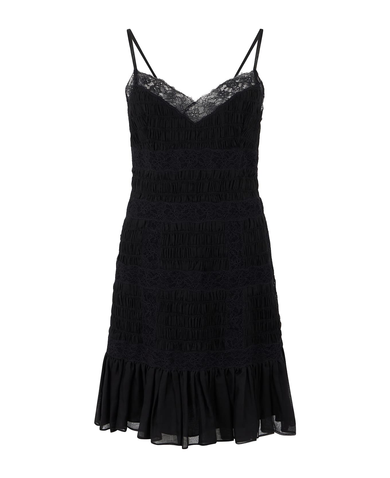Short dress in black color, characterized by thin straps and an elegant décolleté. the top part features lace details for a touch of refinement, while the skirt gently widens towards the bottom, creating a flowing design. ideal for special occasions or summer evenings, this dress combines style and comfort. made with lightweight materials, it offers a comfortable and fresh fit. perfect to pair with high-heeled shoes or sandals.