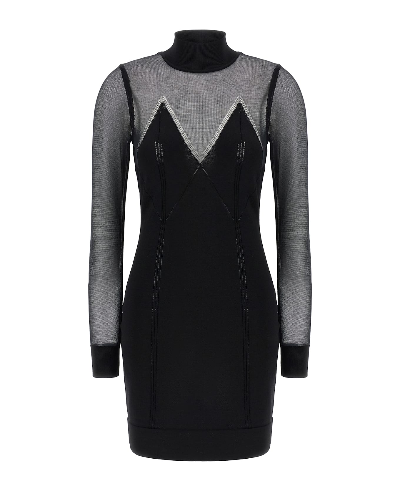 Mini dress in viscose and stretch cotton blend with superior transparencies, high neck, long cuffed sleeves, and band on the hem.