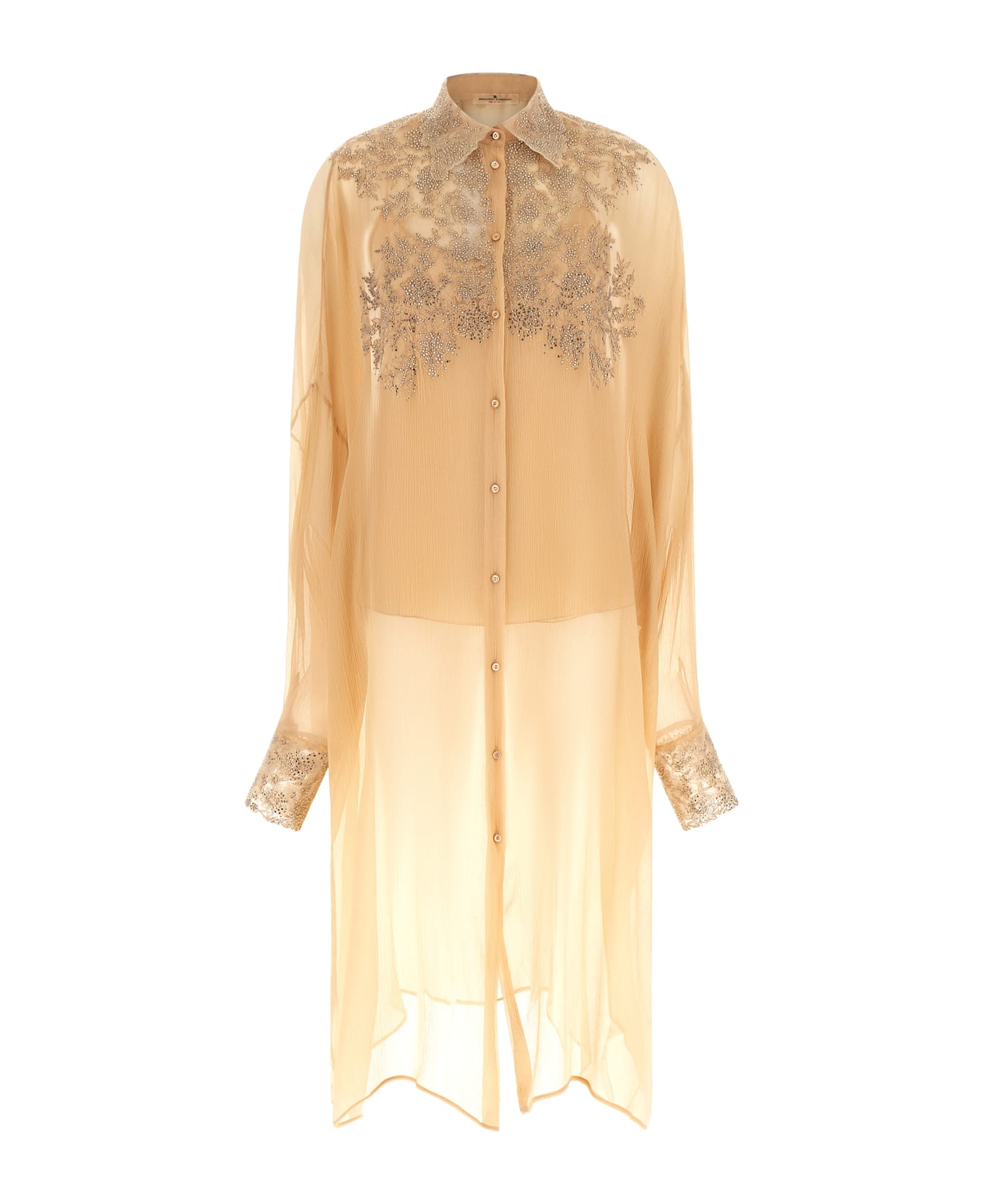 Semi-transparent silk shirt dress with removable matching top, collar, embroidery and front applications, button closure, long cuffed sleeves.