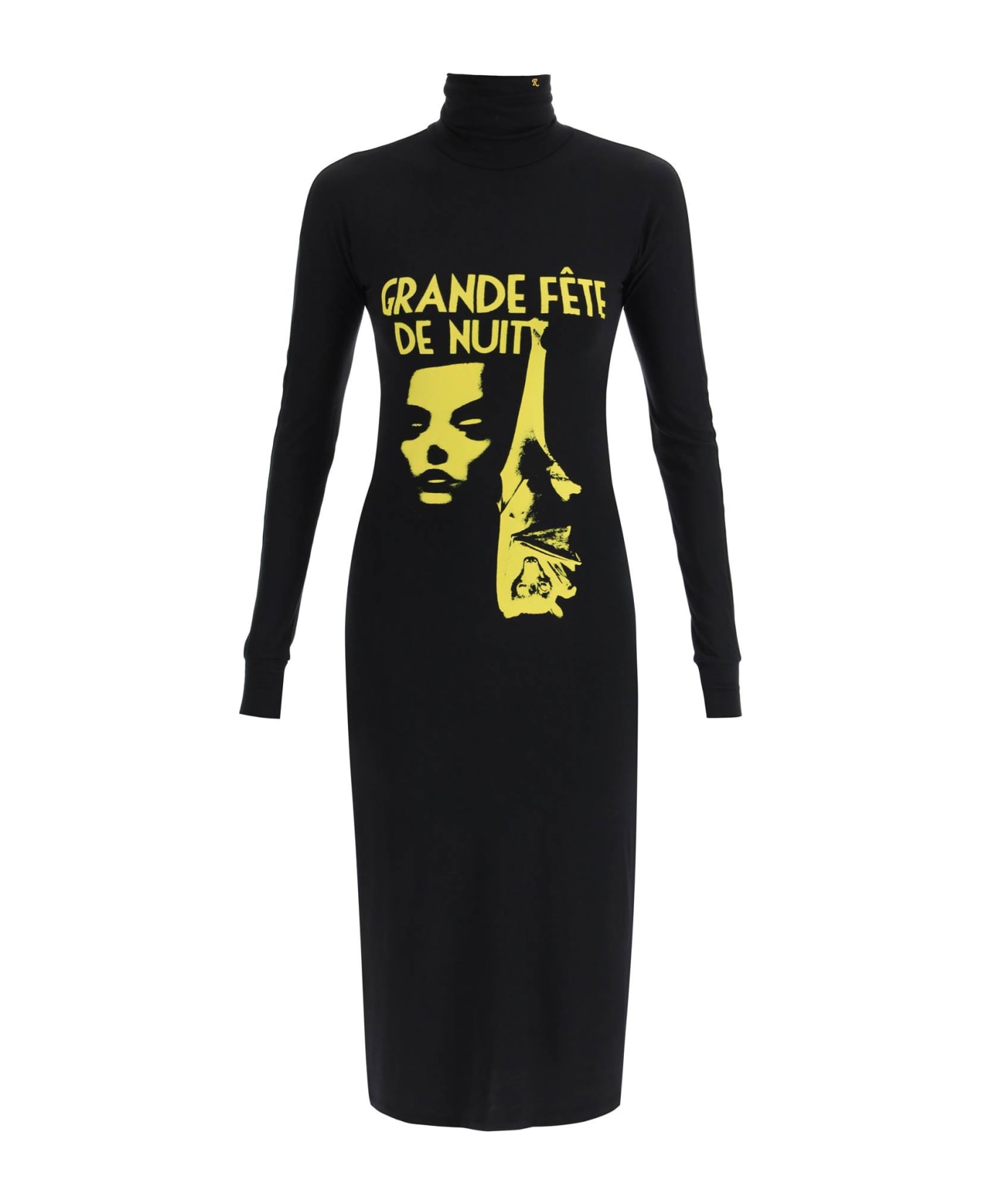 Raf Simons turtleneck dress crafted in stretch Micromodal with contrasting "Grande fête de nuit" print on front. Contrasting "R" detail embroidery on the neck. Body-hugging fit. Knee-length. The model is 177 cm tall and wears a size XS.