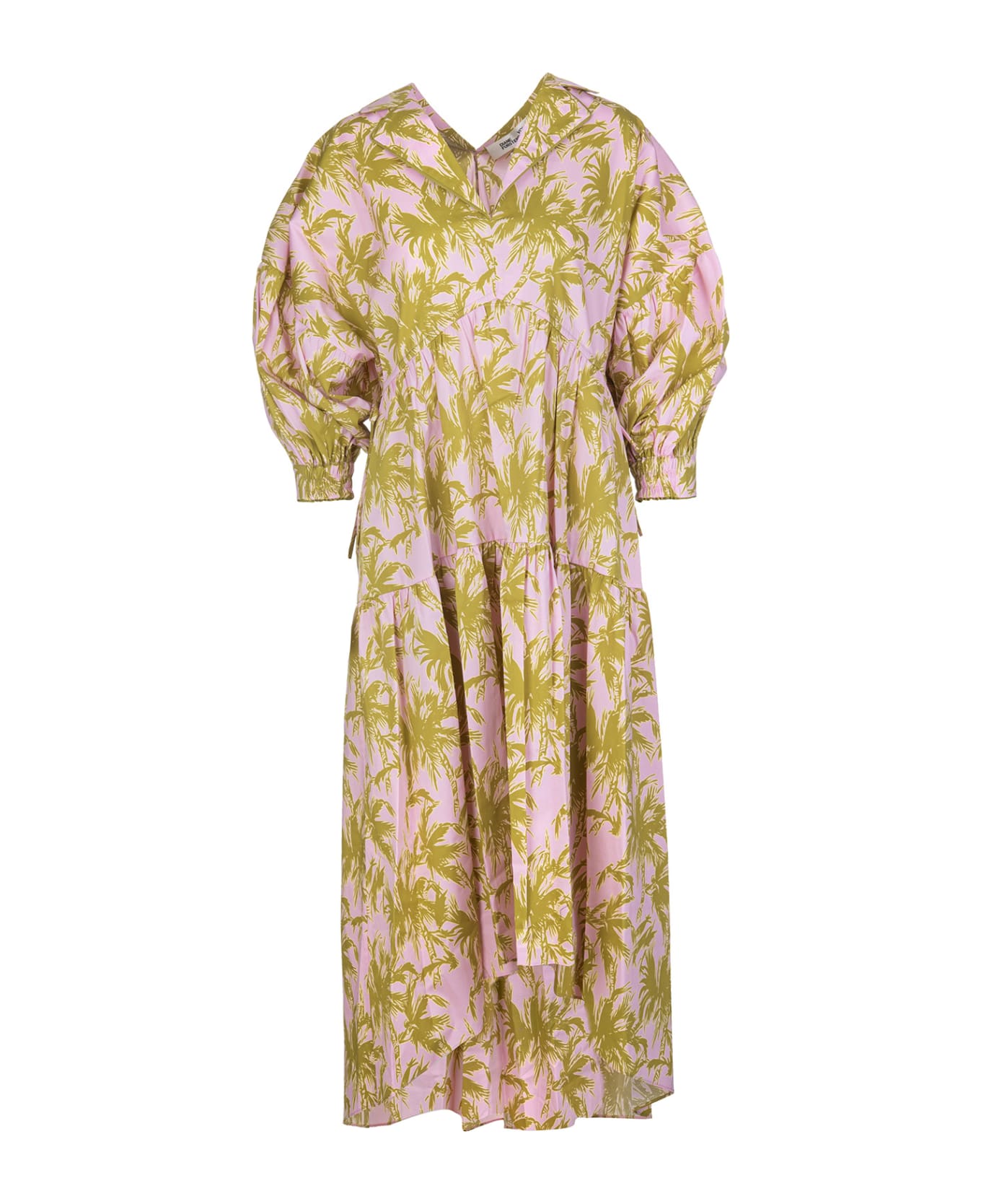 Heather midi dress by Diane Von Furstenberg crafted in pink cotton poplin with an all-over green palm print. Model with a soft silhouette featuring a small classic lapel, chic puffed half sleeves, internal pockets on the sides, a flounced skirt with an asymmetrical hem.